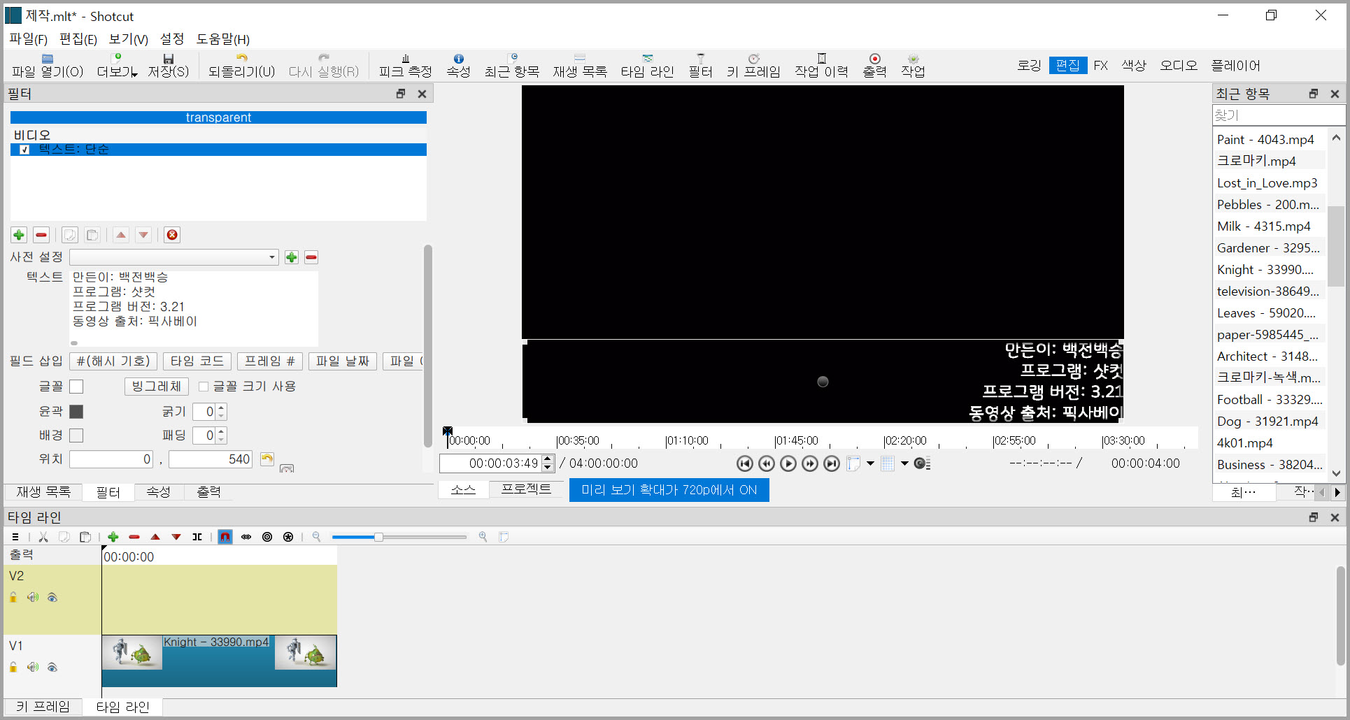 아래 애니메이션같이 샷컷을 이용해서 동영상 제작을 위한 텍스트가 아래에서 위로 이동하는 효과를 만드는 것이다. 많은 동영상 편집 프로그램에서 아래와 같이 텍스트가 이동하는 효과는 기본으로 제공한다. 아래 것을 하려면 샷컷에서 텍스트 삽입, 키 프레임 등 확실히 알아야 한다.