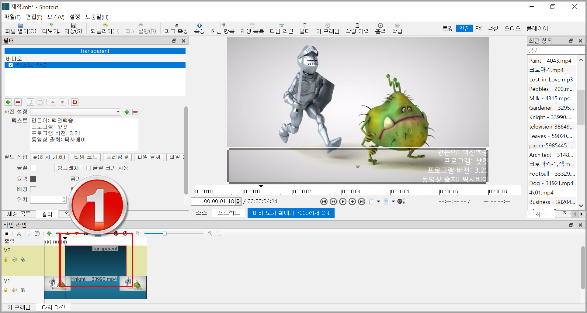 4. 텍스트를 입력했으면 텍스트를 동영상에 삽입하기 위해서 타임라인에 끌어서 놓는다. 타임라인에서 텍스트가 보이게 아래 그림 1번처럼 재생 바를 텍스트 영역에 있는 곳에 위치시키고 텍스트 영역을 선택한다. 텍스트에 필터를 줄 것이니 텍스트 영역을 선택하는 것이다. 만약 동영상에 필터를 줄 것이면 동영상을 선택하면 된다.