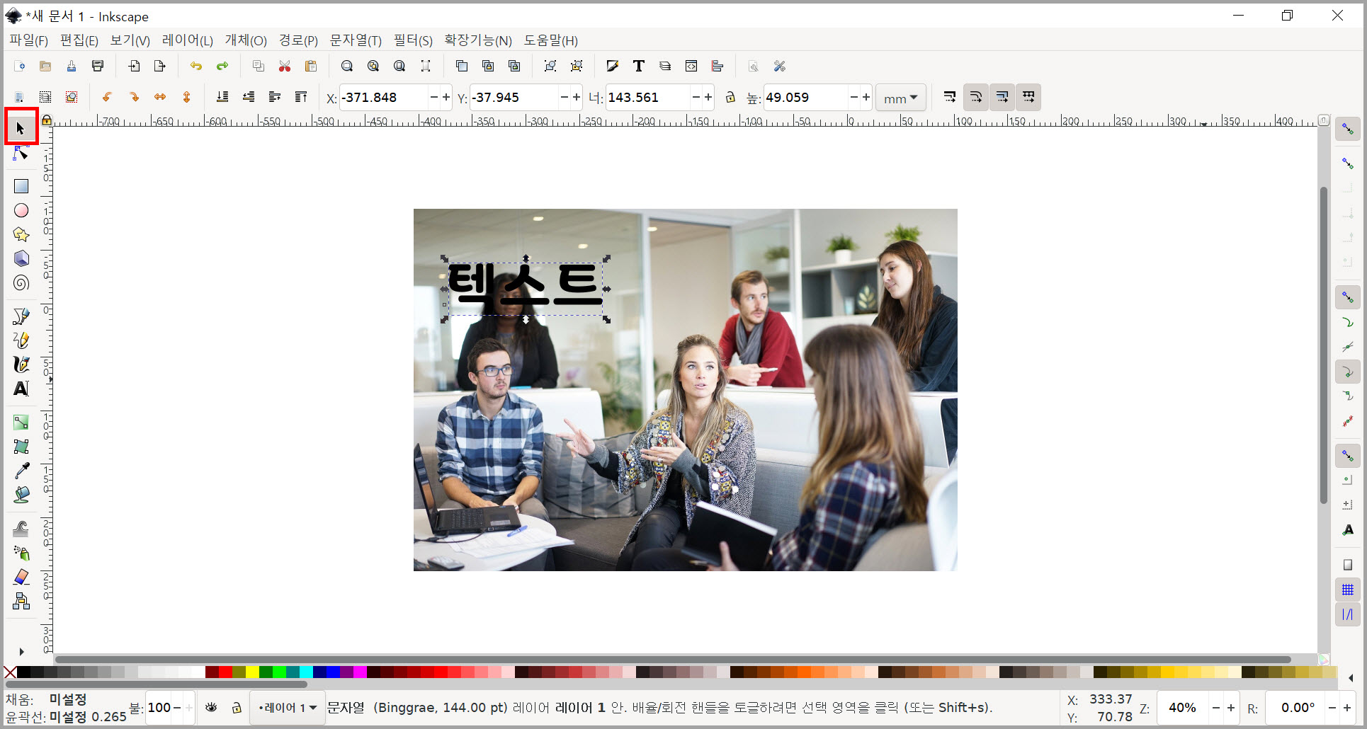2. 글자를 입력한 후 글자를 선택하기 위해 화살표 선택 도구를 클릭한다. 참고로 여기에서 텍스트 색은 중요하지 않다. 왜냐하면 텍스트로 이미지를 사용할 것이기 때문이다. 그러니 텍스트 색은 아무 색이든 상관없다. 글꼴은 빙그레체로 했고 여기에서 다운로드를 할 수 있고 빙그레체를 설치하면 빙그레체를 포함하여 빙그레체2, 빙그레 싸만코체, 빙그레 메로나체, 빙그레 따옴체가 설치된다.