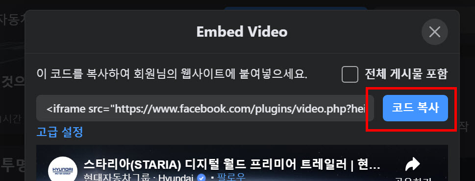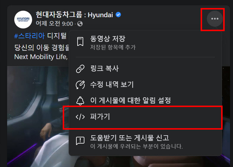 페이스북도 인스타그램과 비슷하다. 왼쪽 상단 상단 점 세 개를 클릭한 후 퍼가기에서 코드 복사를 클릭하면 된다. 참고로 트위터는 임베드에 있다.