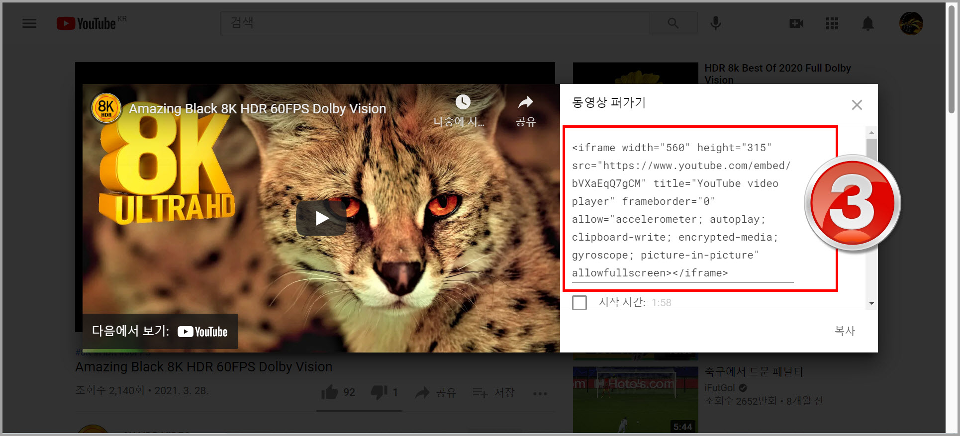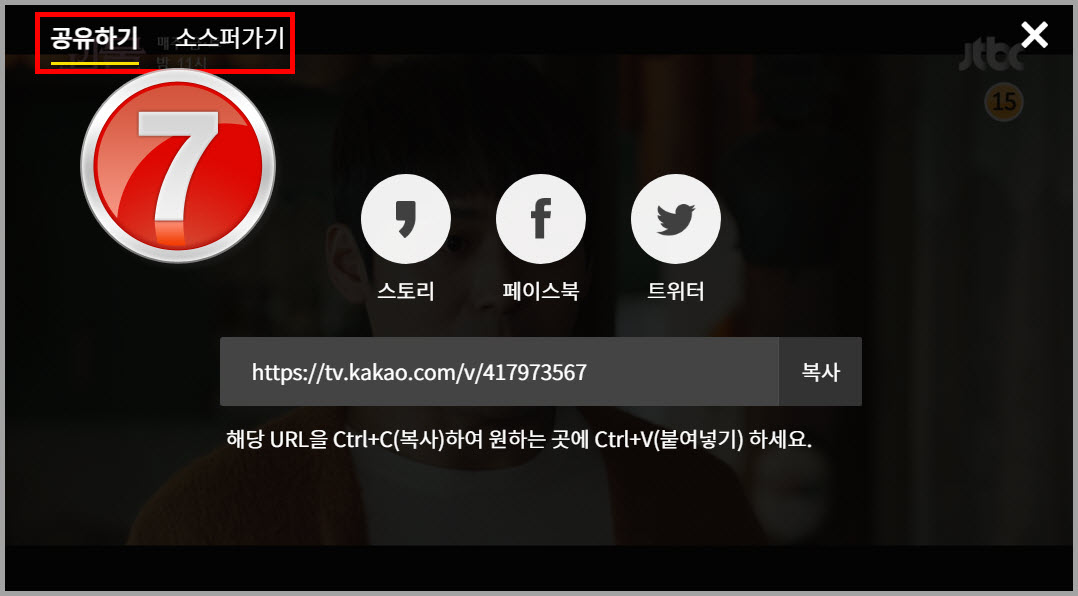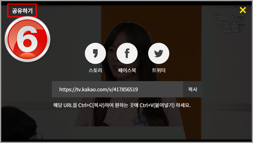 그런데 공유를 위한 아이프레임(iframe)을 포함한 소스가 아닌 URL만 제공하는 경우 동영상을 삽입 불가능할 것 같다. 특히 일부 동영상은 공유 URL만 제공해 그 동영상을 퍼와야 한다면 낭패일 것이다. 아래는 카카오TV 일부인데 해당 동영상의 공유는 7번처럼 소스 퍼가기가 없이 단지 6번처럼 공유 URL만 제공한다.