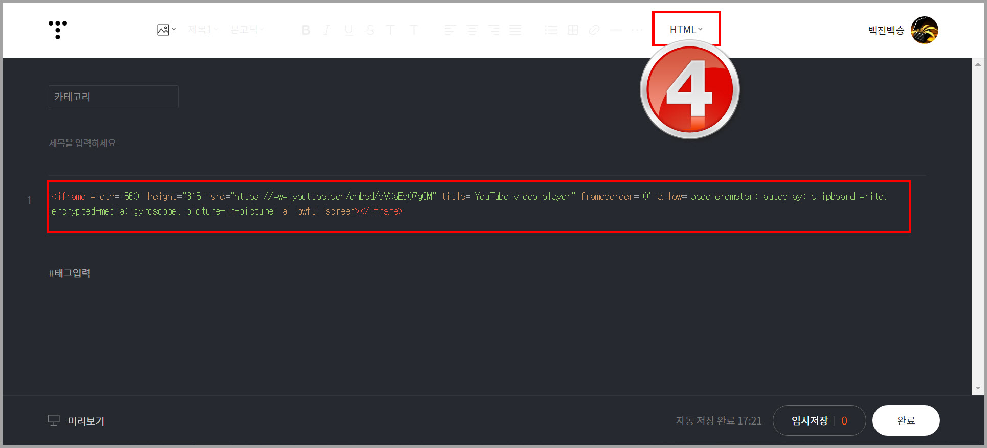 또는 다른 방법으로 삽입할 수 있는데 2번 퍼가기에서 아이프레임 소스인 3번을 복사해서 4번처럼 기본모드에서 HTML로 변환해서 임베드 소스를 붙일 수도 있다.