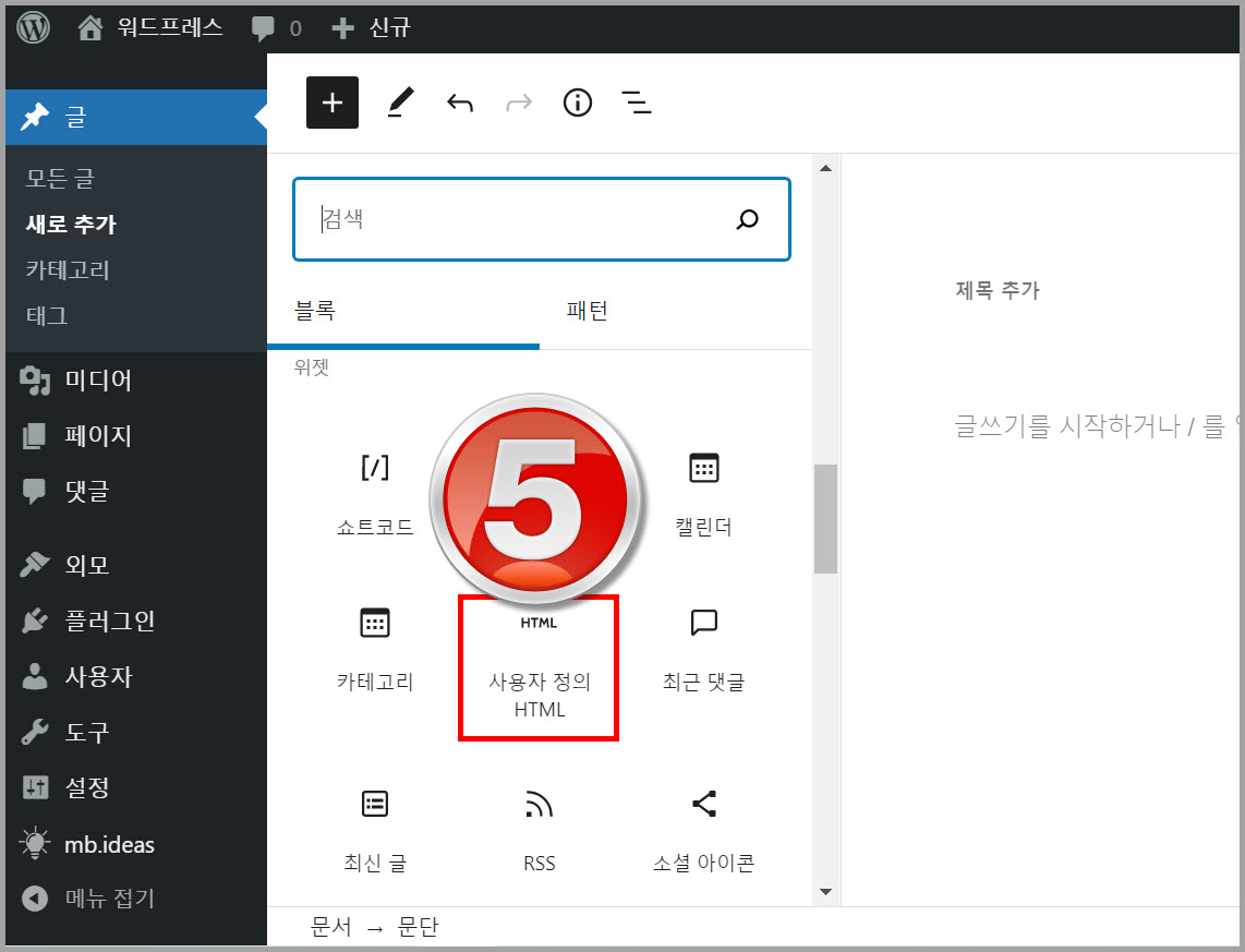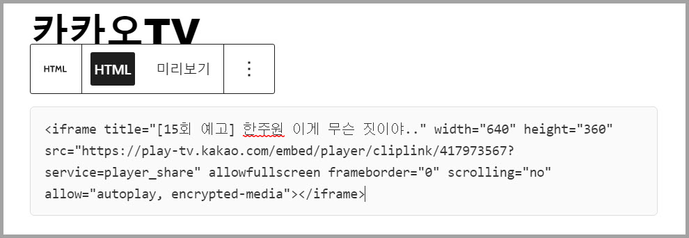 임베트가 없는 카카오TV와 네이버 TV의 경우는 공유 URL로 삽입을 할 수 없다. 그렇다고 거기 있는 동영상을 삽입을 할 수 없는 것을 아니다. 카카오 TV와 네이버 TV는 아래 그림 5번 사용자 정의 HTML을 이용하여야 한다.