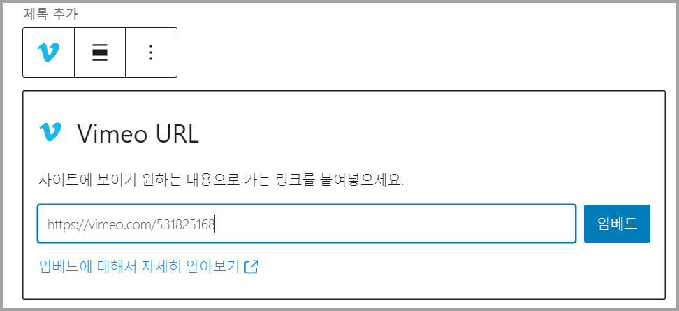 위에서 동영상 공유 플랫폼의 임베드에 유튜브(YouTube)와 비메오(Vimeo)가 있어서 간단히 공유 URL만 복사하여 붙이고 임베드 버튼만 누르면 에디터에 동영상을 간단히 삽입할 수 있다.