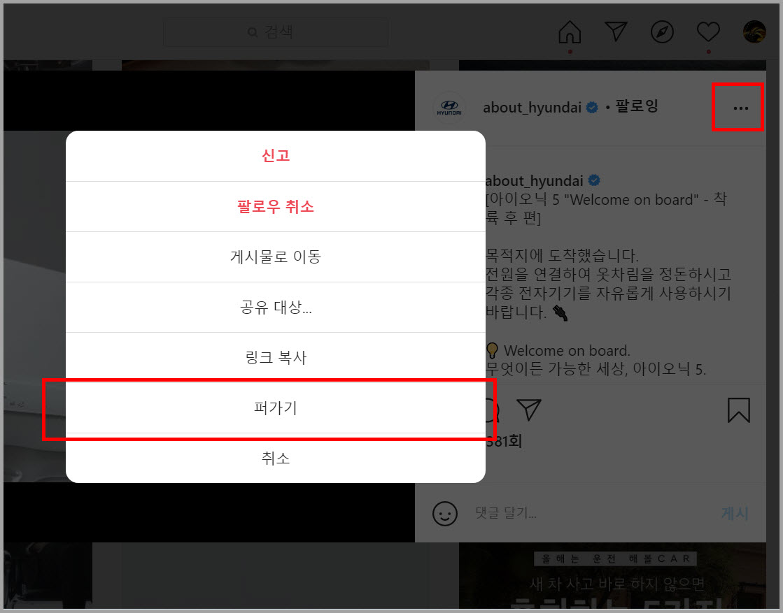 임베트 목록에 많이 사용하는 페이스북과 인스타그램도 없다. 만약 거기에 있는 동영상을 삽입하고 싶다면 마찬가지로 사용자 정의 HTML로 삽입한다. 인스타그램이라면 동영상을 클릭하고 상단 점 세 개를 클릭한다. 퍼가기를 누른 후 Embed 태그 복사하면 된다.
