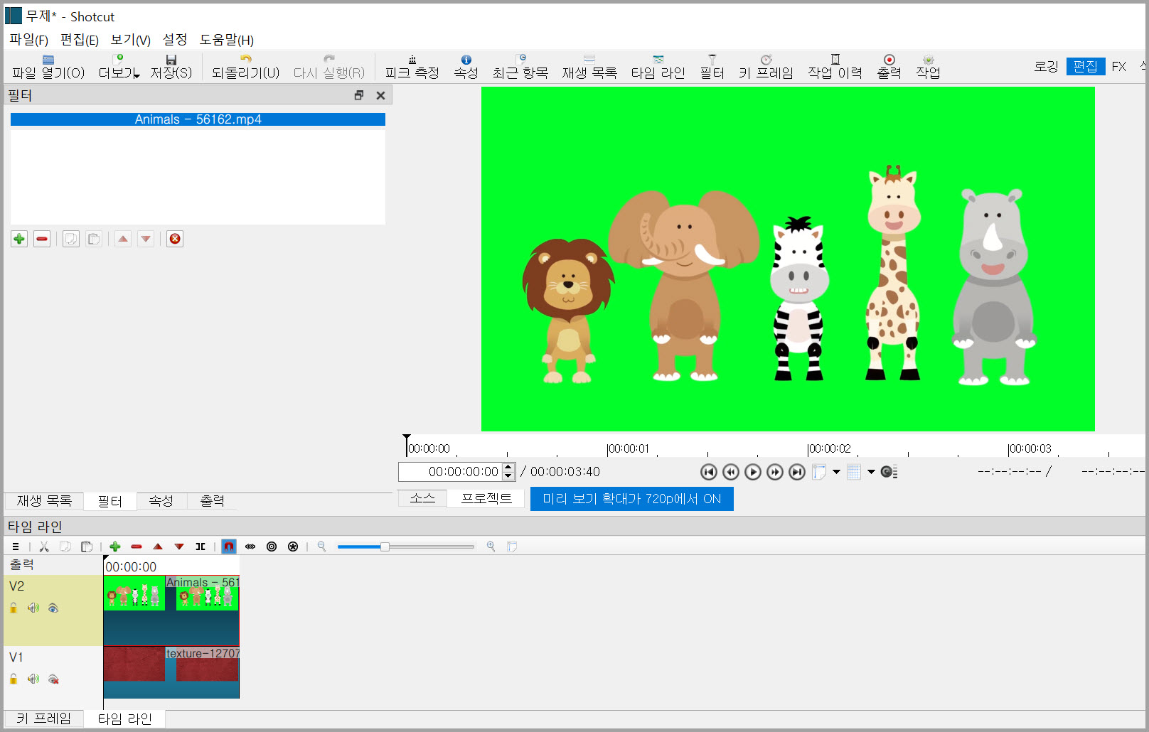 아래와 같은 그림을 보면 영상 아래 그림이 보이지 않을 것이다. 왜냐하면 그림 위 영상에 가려 당연히 안 보인다. 그러기 위해서는 크로마키를 위해서 위 영상의 연두색 배경 등을 투명으로 지정하면 아래 그림이 보이게 된다.