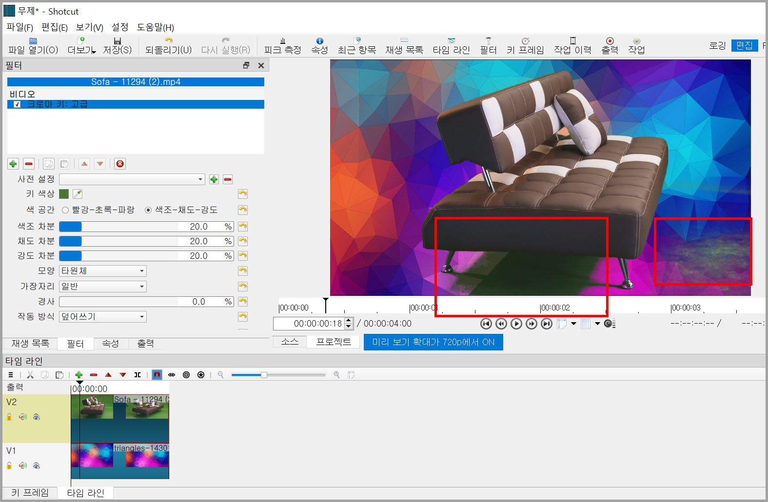내가 실력이 없어서 위 영상을 샷컷에 있는 크로마키:고급의 옵션을 이용해도 완벽하게 소파만 남게 투명으로 할 수 없다는 것을 알았다. 아래 그림을 보듯이 영상 모든 부분을 투명하게 할 수 없었다. 빨간색 사각형 부분의 녹색은 없앨 수 없었다.