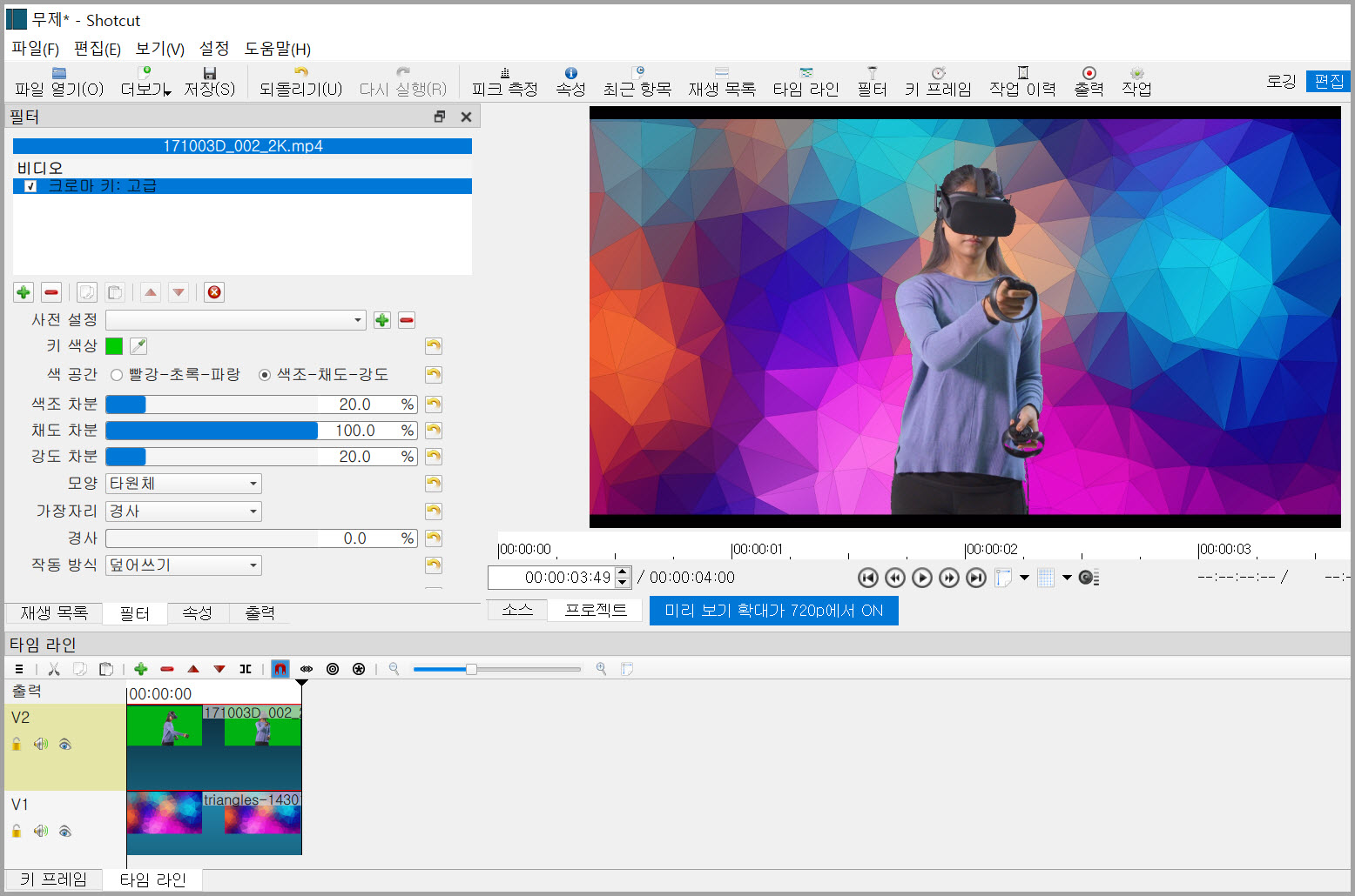 그래서 크로마키 옵션이 많은 크로마키:고급에서 제공하는 여러 옵션 중에 수치를 조절하여 영상의 녹색 배경 모두를 투명으로 처리할 수 없었다. 녹색을 투명으로 처리하기 위해 다른 옵션을 조절하면 영상이 다른 부분이 투명이 되는 경우가 많았다.