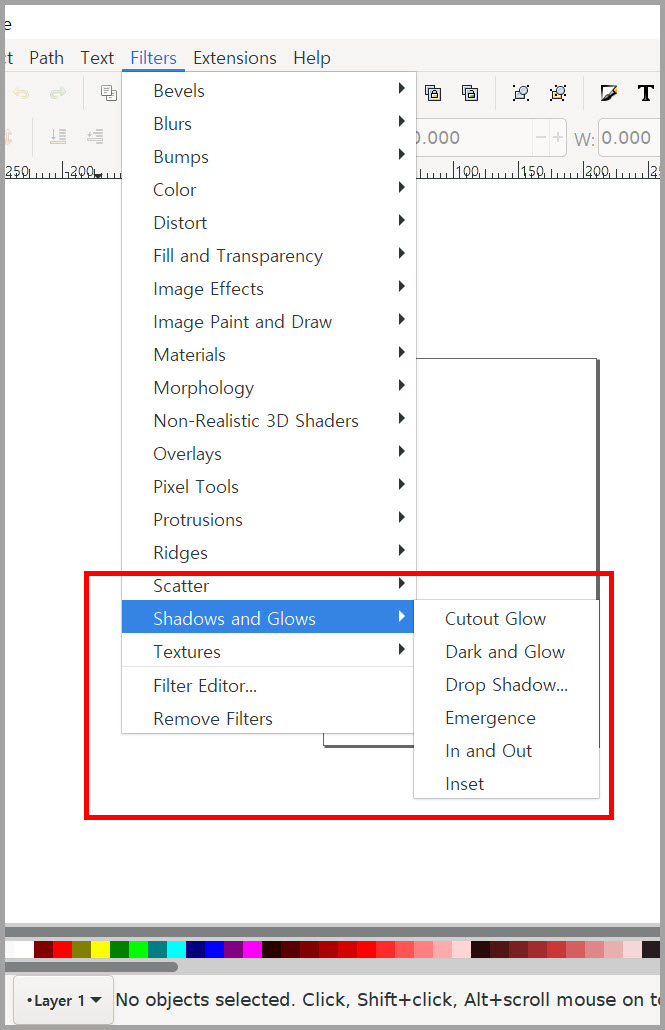잉크스케이프에서 필터로 파내는 효과를 만드는 방법은 두 가지 방법이 있다. 첫 번째는 물방울 그림자를 이용할 수도 있고 두 번째는 도려내기 발광이라는 필터를 이용할 수 있다.
