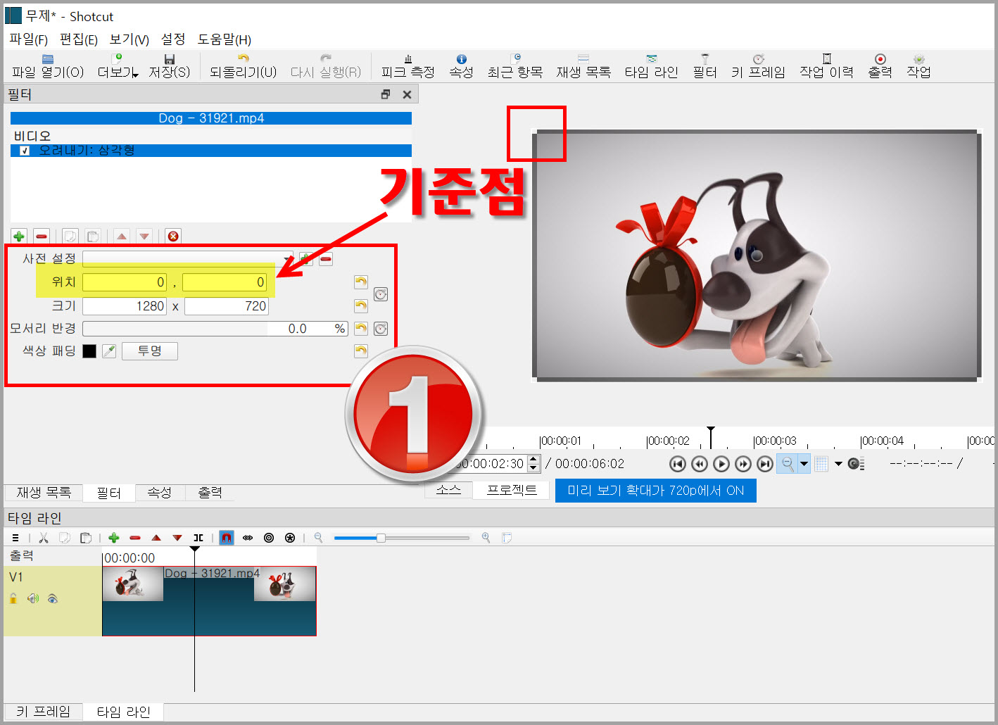 오려내기:삼각형 옵션은 아래 그림 1번과 같고 자르는 위치인 경우 사격형 네 개 점 중에 상단 왼쪽 점이 기준이다. 영상의 크기가 1280×720이니 정확히 가로로 반으로 자르고 싶다면 640이 될 것이고 영상이 왼쪽 부분만 보고 싶다면 위치를 x를 -640하면 된다.