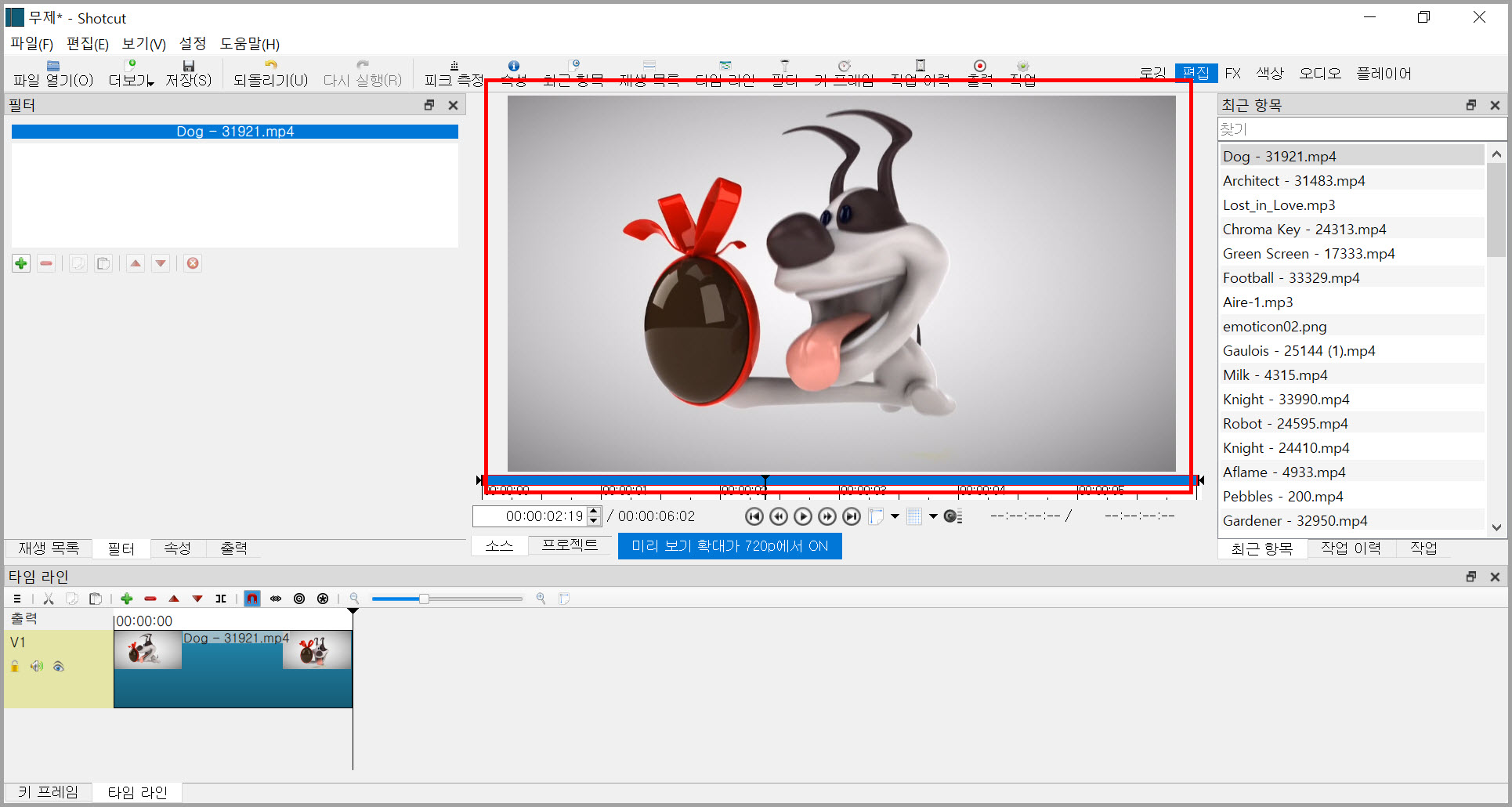 나는 오려내기:삼각형 필터를 자주 사용하므로 샷컷 필터의 즐겨찾기에 등록했다. 오려내기:삼각형 필터는 필터 > 비디오에서 찾을 수 있다. 필터 사용 전에는 아래 그림처럼 플레이어에 모든 영상이 표시된다.