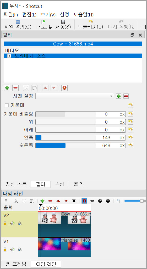 위에서 영상의 왼쪽 부분만 재생했으니 오려내기:삼각형 필터의 수치인 크기를 조절하여 아래는 오른쪽 부분만 재생했다. 수치 등 옵션에 대해서 아래에서 적는다.