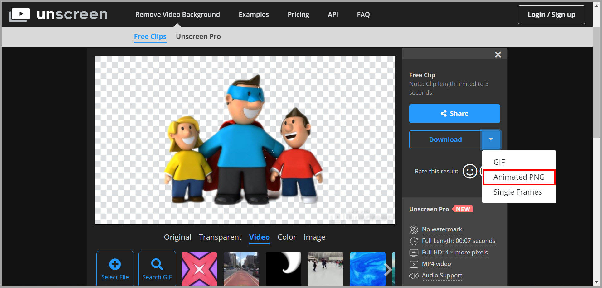 영상 배경 제거에 대한 홈페이지에서 영상 배경을 제거했다. 그런 후 결과물을 다운로드해야 할 때 아래와 같이 Animated PNG라는 것이 있다는 사실을 알아 적어보려 한다. 영상을 투명하게 하여 두 영상을 합성하는 크로마키에 대해 적다가 영상 및 사진의 배경을 투명하게 하는 홈페이지를 알게 됐다.