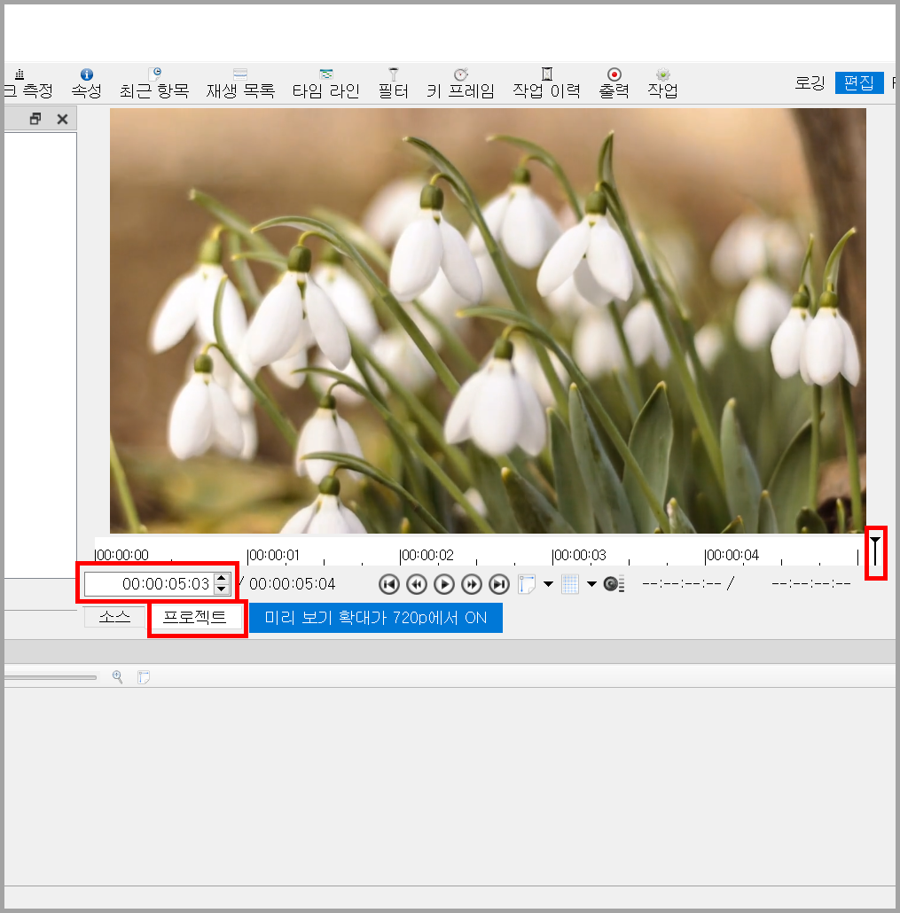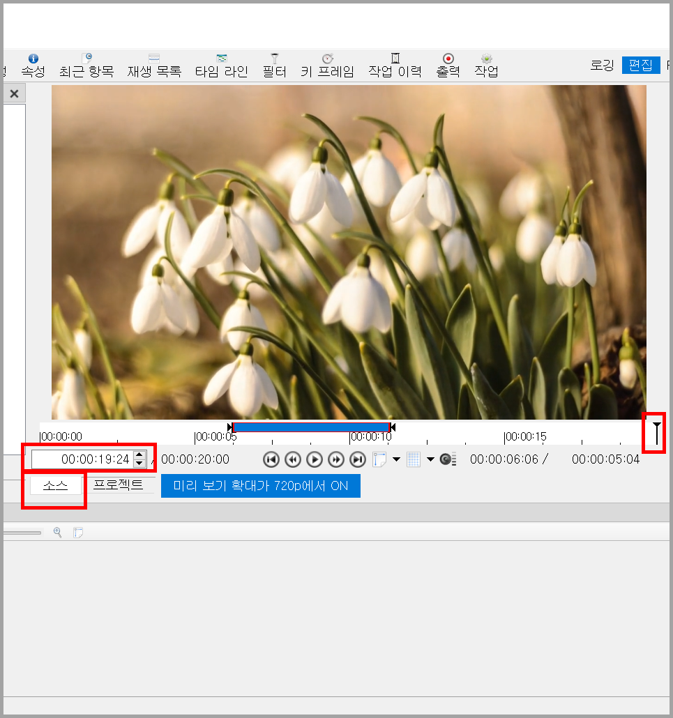 동영상이 타임라인에 삽입되면 소스에서 프로젝트로 전환된다. 얼마나 잘렸는지 확인하기 위해서 소스에서 바로 확인할 수도 있지만 소스와 프로젝트를 클릭하여 확인할 수도 있다. 아래 그림을 보면 소스에 나타난 원본은 19:24초지만 자른 후는 프로젝트를 보면 05:03초다.