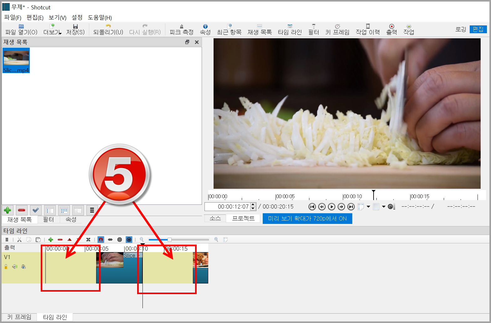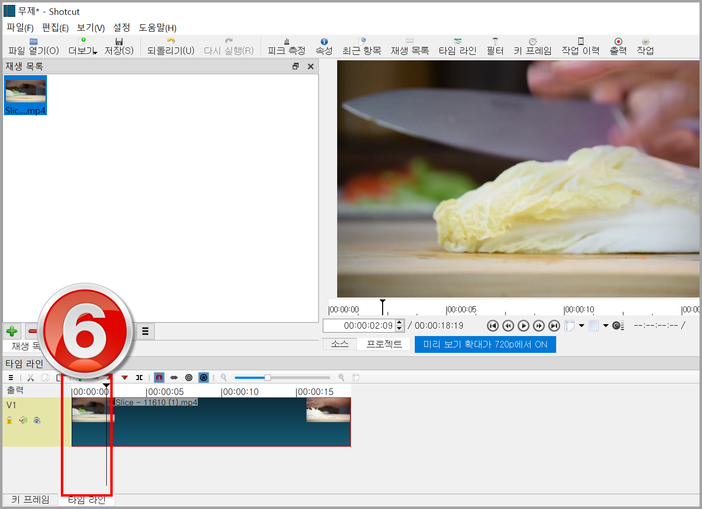 아래 그림을 보면 배추를 써는 동영상이 있다. 써는 준비 과정이 약 2 초인데 그 부분을 잘라내고 바로 썰게 하기 위해 아래 1번이나 2번 중 하나를 선택할 수 있다.