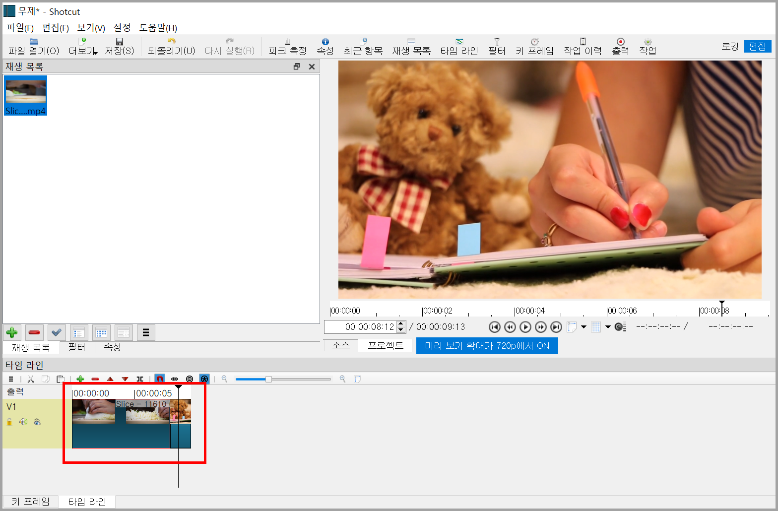 동영상이 첫 프레임부터 마지막 프레임이 삽입되는 것을 하고 싶지 않은 사람도 있다. 그런 사람을 위해 단축키 i나 o를 누르면 동영상을 잘라 타임라인에 삽입할 수 있다. i를 누르면 시작하는 프레임이 되고 o를 누르면 끝나는 프레임이다. 그래서 아래 그림처럼 자른 후 타임라인에 삽입했다.