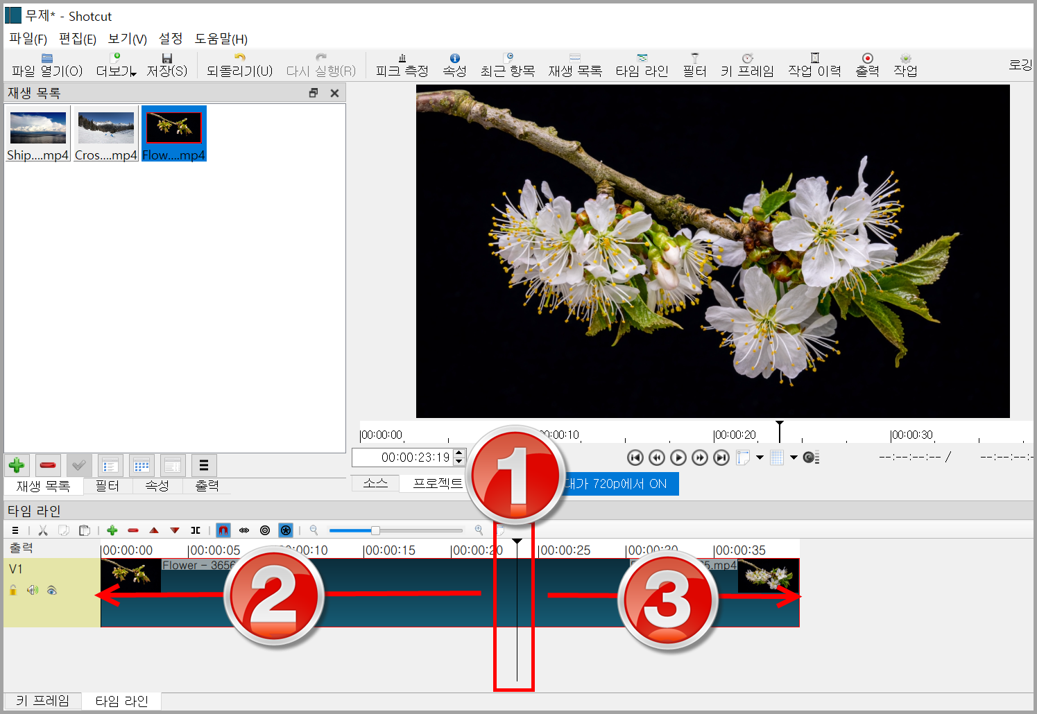 Shift+i, Shift+o, i, o는 아래 그림 1번 재생 헤드의 위치에 따라 좌우인 2와 3번 방향으로 자른다. 아래 글에서 알겠지만 타임라인에서 i는 사용하지 않는다. i는 플레이어에서 사용하는 경향이 있을 것이다.