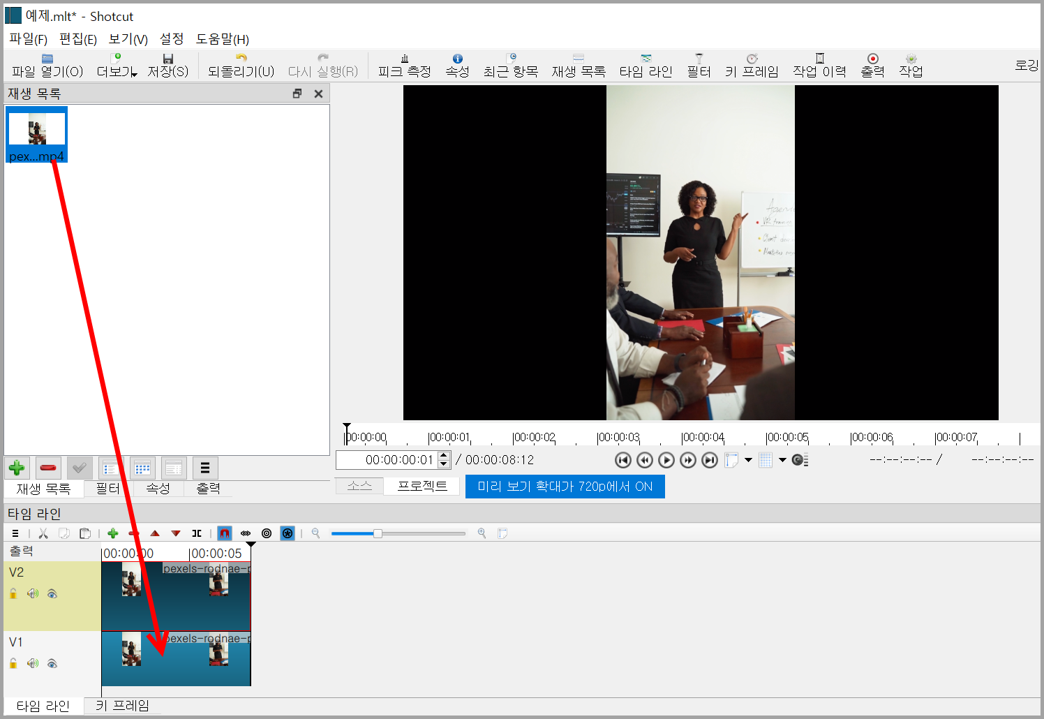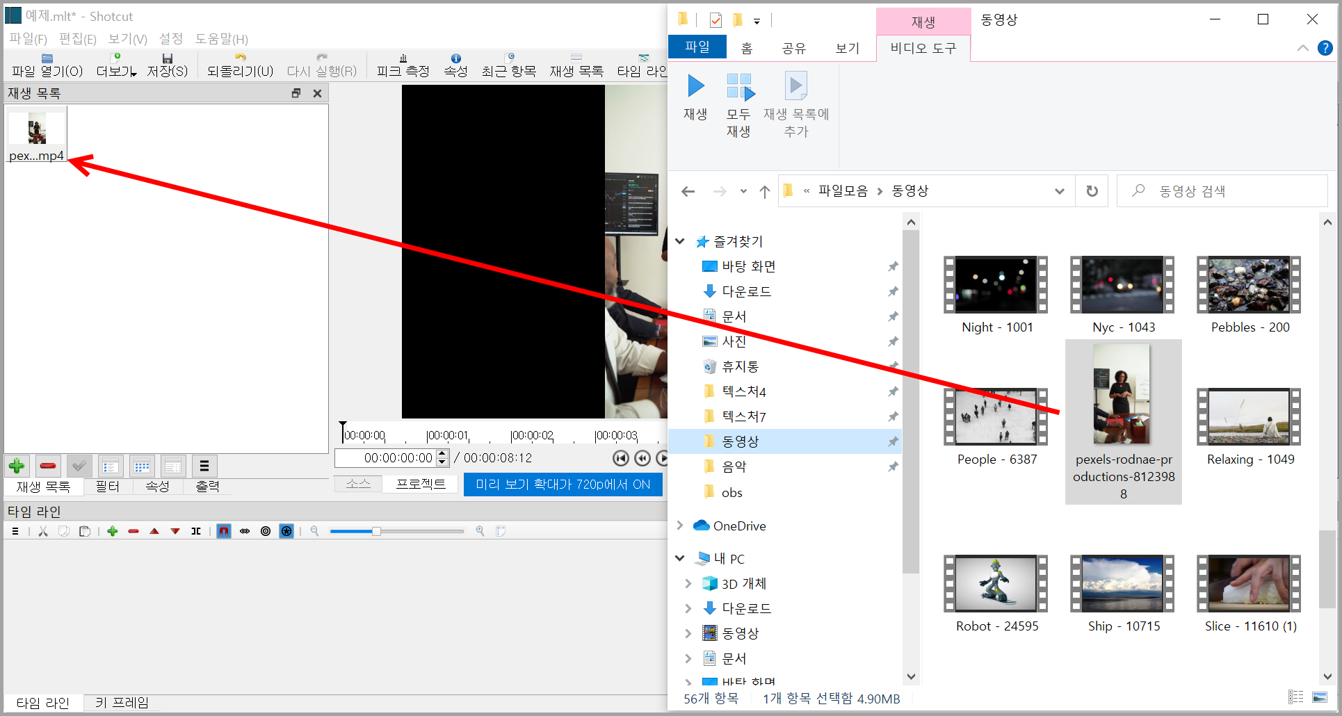 1. 나는 프로젝트를 예제라는 이름으로 해서 만들었다. 그리고 탐색기에서 샷컷의 재생 목록에 편집할 동영상을 끌어서 놓았다. 그러면 동영상이 추가됐다.