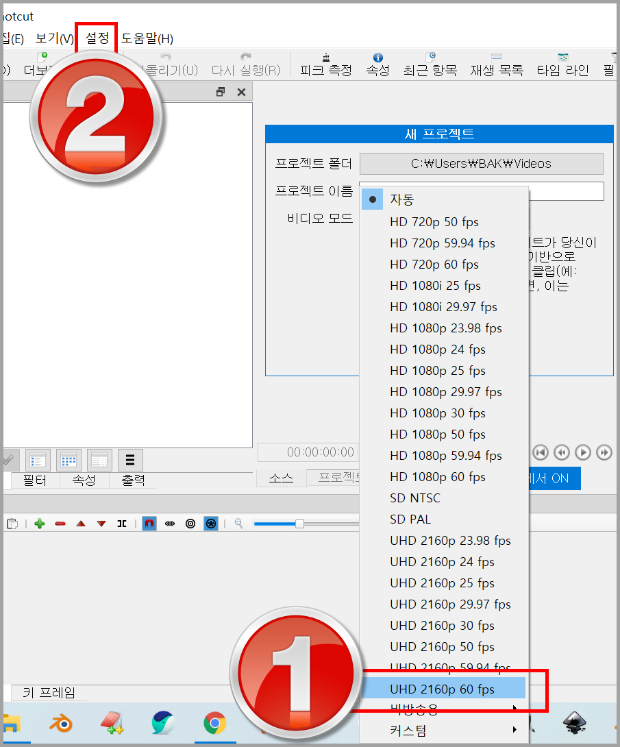 샷컷에서 비디오 모드 자동은 동영상, 이미지 등 첫 파일의 해상도와 프레임 레이트를 기반으로 한다는 것을 알 것이다. 대부분 비디오 모드를 자동으로 한다. 만약 첫 파일이 아니라 내가 임의로 정하고 싶다면 최대인 아래 그림 1번 UHD 2160p 60 fps로 설정할 수도 있다. 참고로 비디오 모드는 2번 설정을 눌러도 변경할 수 있다.