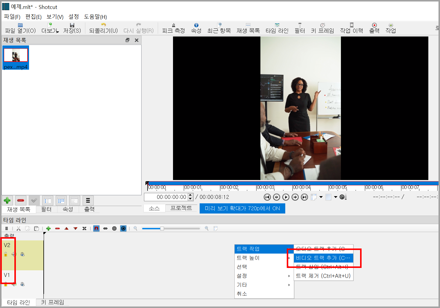 2. 타임라인에 비디오 트랙 두 개를 추가하면 이름이 V1, V2라고 된다. 그런 후 재생 목록에 있는 동영상을 타임라인에 추가한다. 참고로 동영상을 샷컷이 아닌 탐색기에서 타임라인에 바로 추가할 수도 있다. 참고로 아래 동영상 배경이 검정은 검정이 아니고 투명이다. 아래 강좌를 보면 알겠지만 검정이 투명이므로 V2에 동영상이 있으면 보인다.