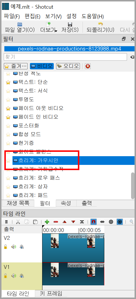 4. 마지막으로 타임라인 V1 트랙에 있는 배경 동영상이 흐리게 하기 위해 필터 > 비디오 > 흐리게: 가우시안을 선택한다. 분량인 수치를 적절히 입력한다.