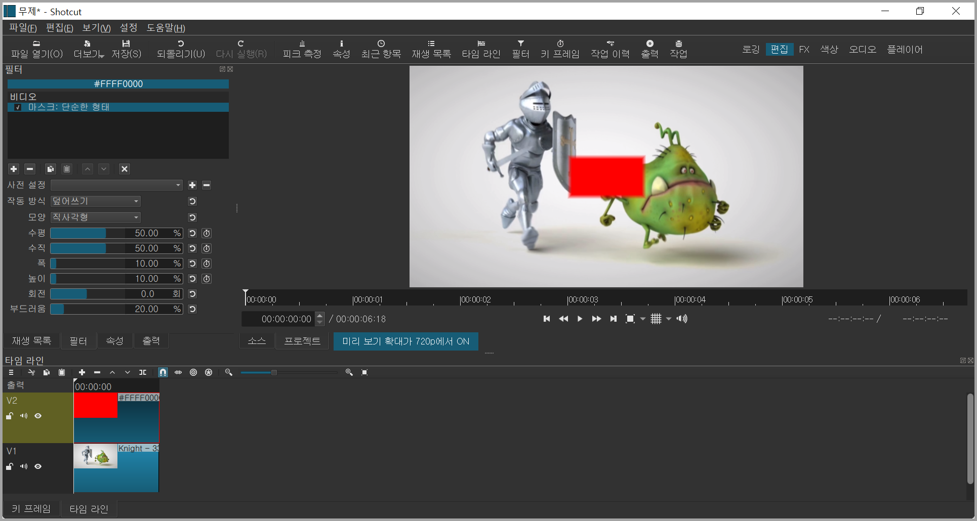 마스크 필터를 적용하지 않았기 때문에 위에 있는 동영상 때문에 아래 있는 동영상이 가려 보이지 않는다. 마스크 필터를 사용하여 위 동영상을 조절함으로써 아래 동영상을 보이게 한다. 위에 있는 동영상에 마스크를 적용하기 위해 필터를 클릭한 후 찾기에서 마스크를 입력한 후 마스크:단순한 형태를 선택한다. 또는 마스크는 필터 > 비디오 > 마스크: 단순한 형태에서 찾아도 된다.