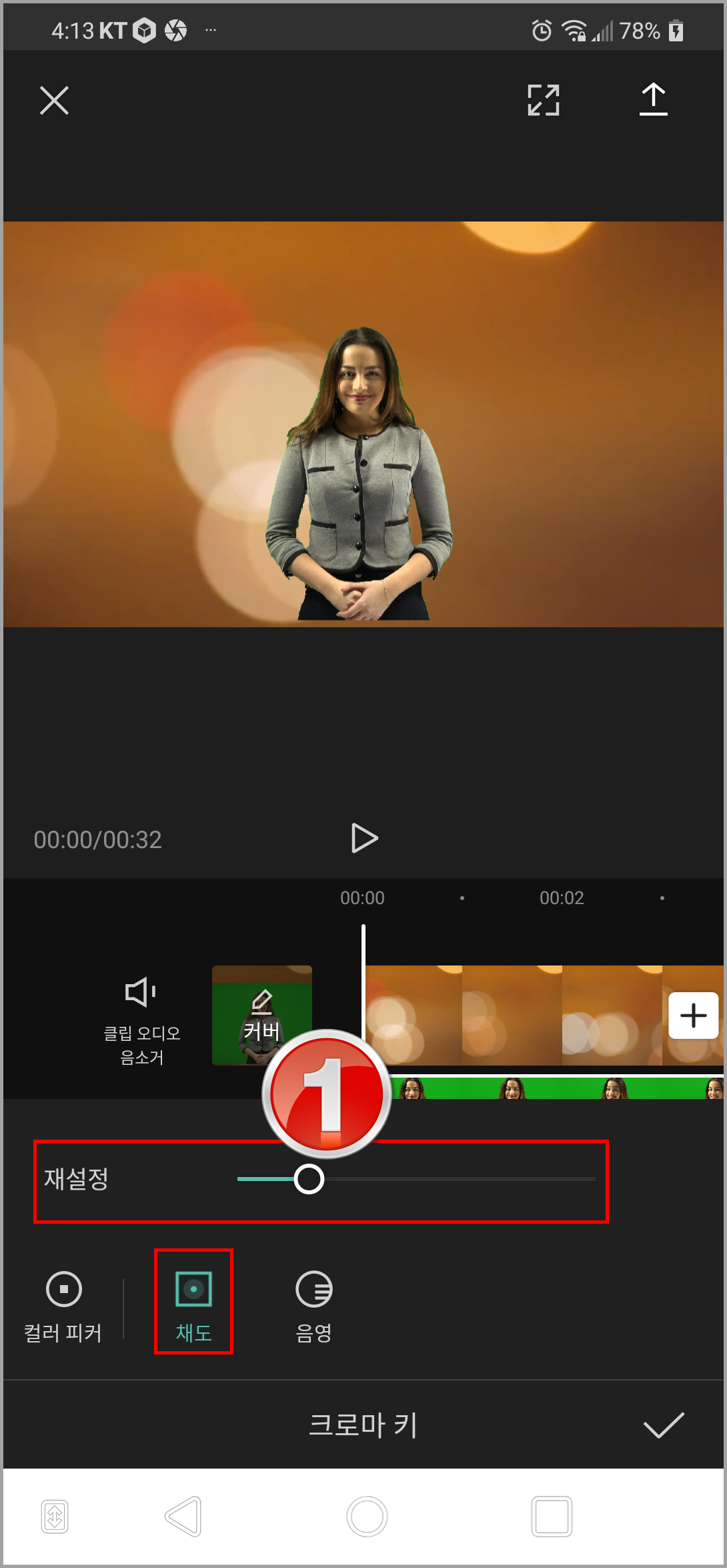 크로마키로 합성하면 다음 화면이 나오면서 아래 그림 1번과 같은 옵션이 나온다. 1번 수치를 조절하면서 사람 주변에 나오는 초록색을 낮출 수 있다. 그런데 아래 그림 두 번째처럼 배경 제거로 동영상 배경 제거 후 합성하면 그렇게 할 수 없다.