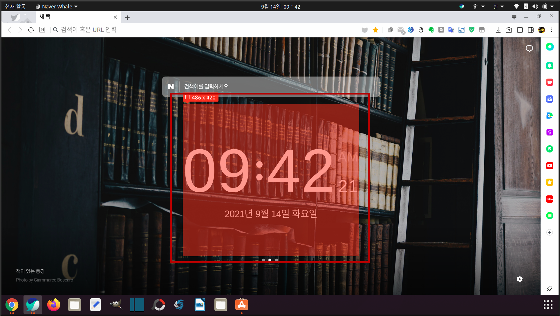 우분투에 셔터 설치 후 여러 번 사용했다. 윈도 캡처 프로그램에 비하면 기능이 약해도 편집을 통하면 캡처한 이미지에 도형, 텍스트 등을 자유롭게 넣을 수 있다. 아쉬운 것이 하나 있는데 영역을 선택할 수 없다는 것이었다. 아래 그림은 우분투에 설치한 네이버의 웨일 브라우저이다. 셔터(shutter)는 브라우저에 나타난 빨간색 영역을 세분화하여 선택할 수 없었다.