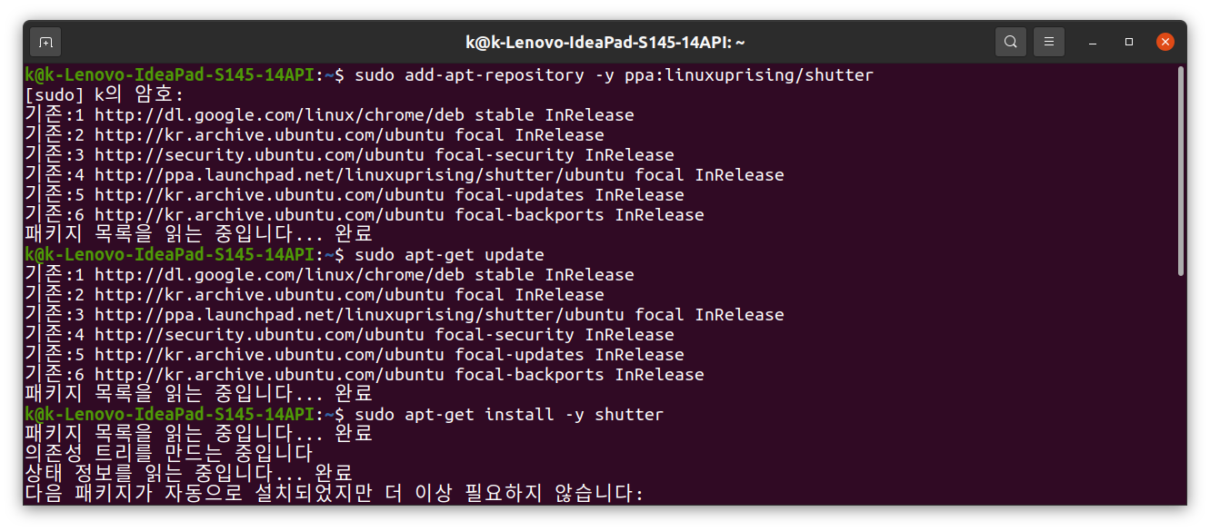그런데 우분투 소프트웨어에서는 Shutter가 검색되지 않아 설치할 수 없었다. 하는 수 없이 터미널을 사용하여 Shutter(셔터)를 설치하는 방법을 검색을 통해 검색했다. 그래서 아래 그림처럼 셔터(Shutter)를 터미널에서 설치한 후 실행시켰더니 아래와 같았다. 참고로 아래 있는 명령어는 터미널에서 셔터 설치를 위해 입력한 명령이다.