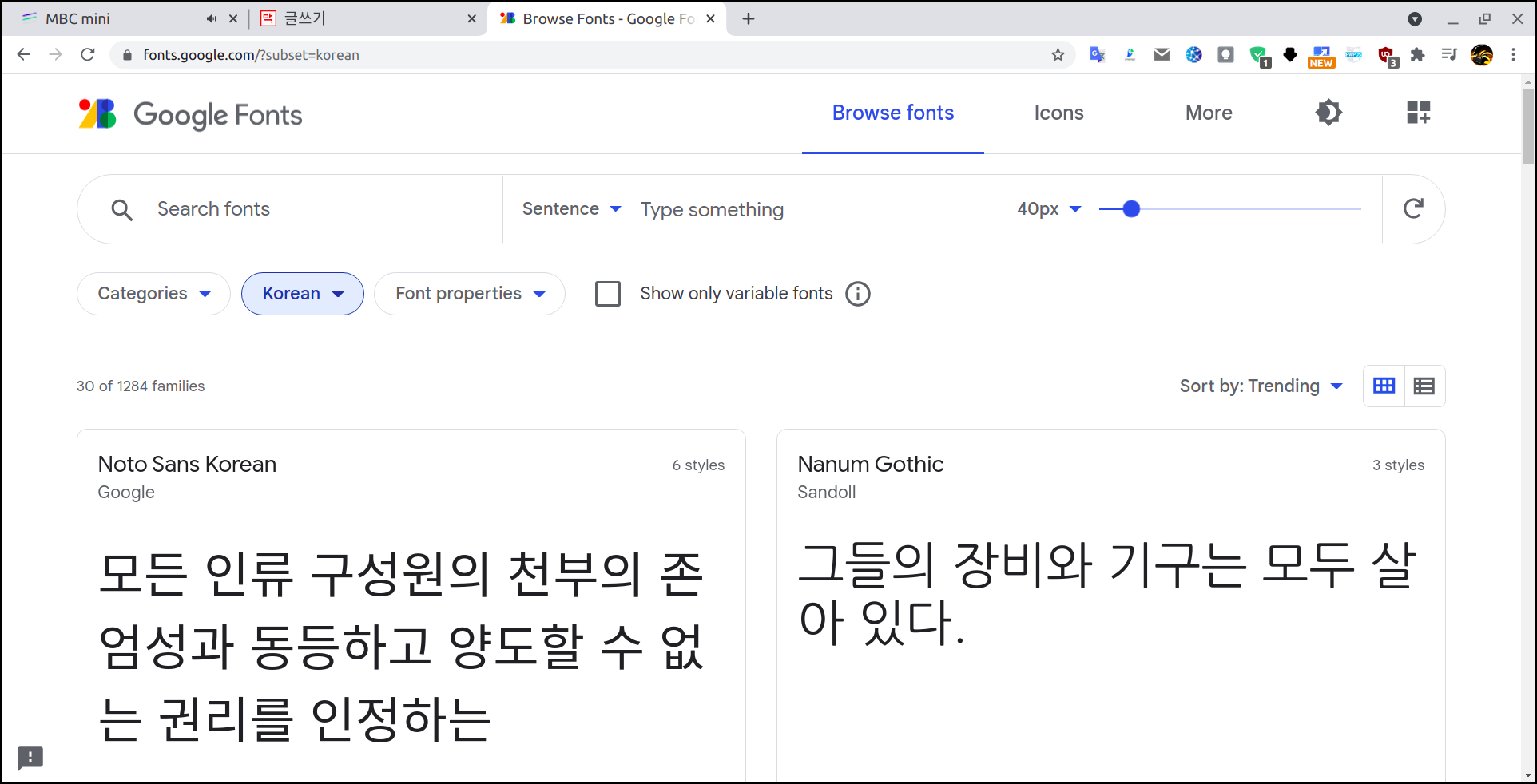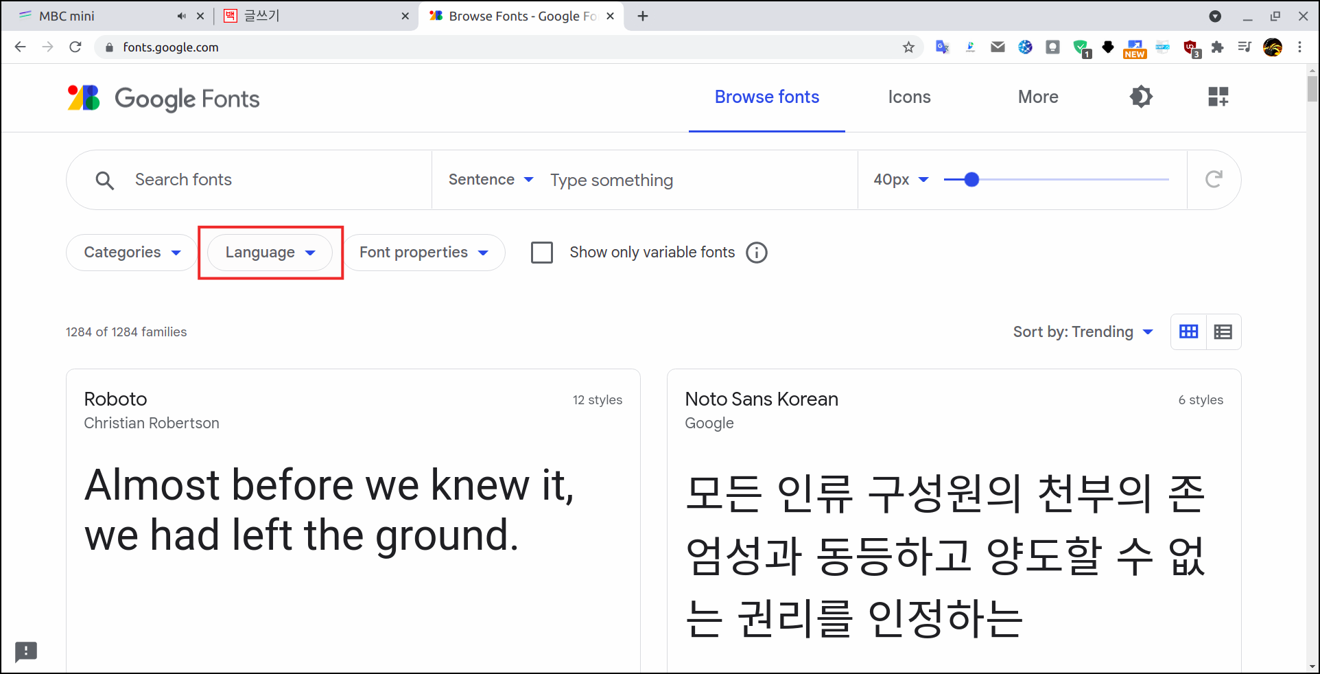 구글 폰트를 등록하는 법도 시스템 폰트를 등록하는 법과 동일하다. 알아야 될 것은 구글 폰트 사이트에서 등록할 폰트 이름만 알면 된다. 나는 구글 폰트를 구글 검색에서 구글 폰트라는 검색어로 찾았고 사이트 주소는 https://fonts.google.com/다. 그 사이트에서 다양한 언어의 글꼴이 나오는데 한글 글꼴만 나오게 하기 위해서 아래 그림처럼 Lanuage > Korean을 클릭하면 된다.