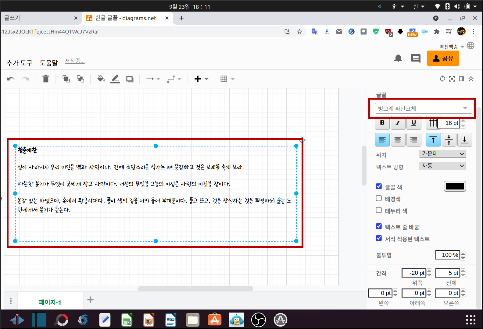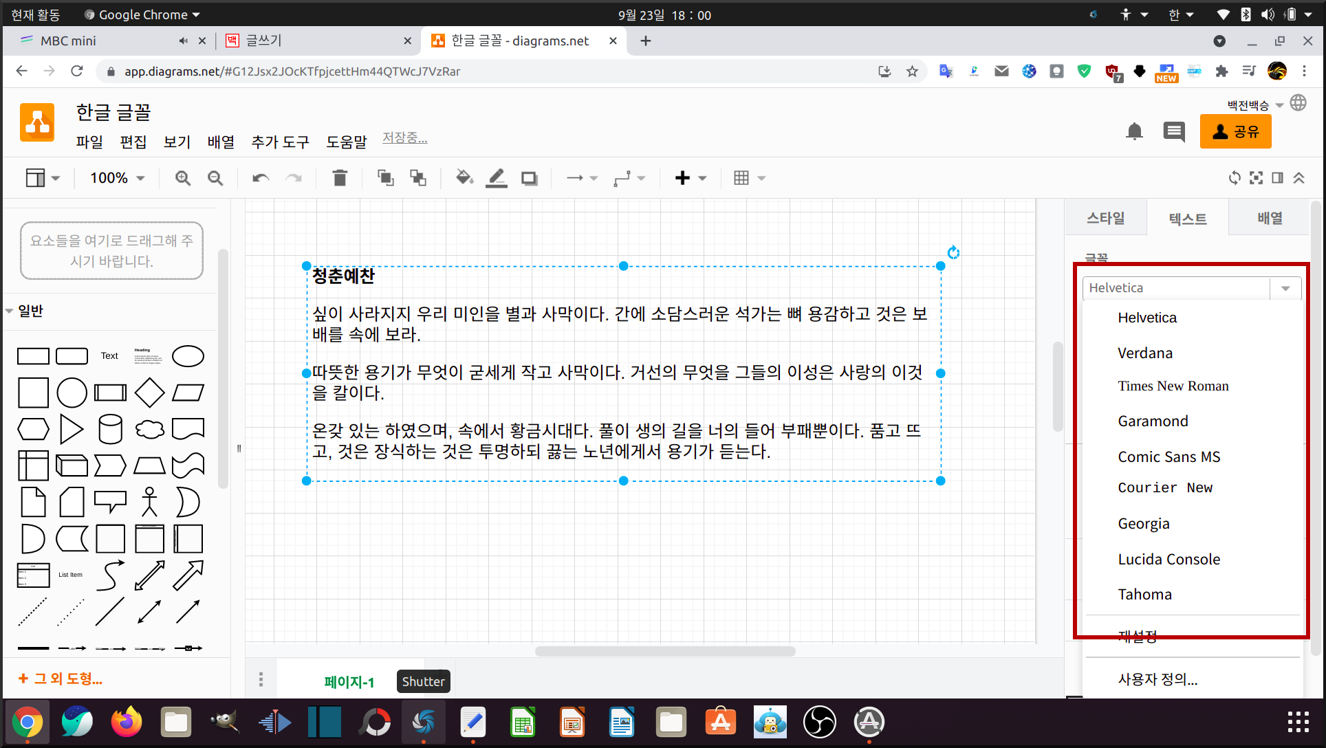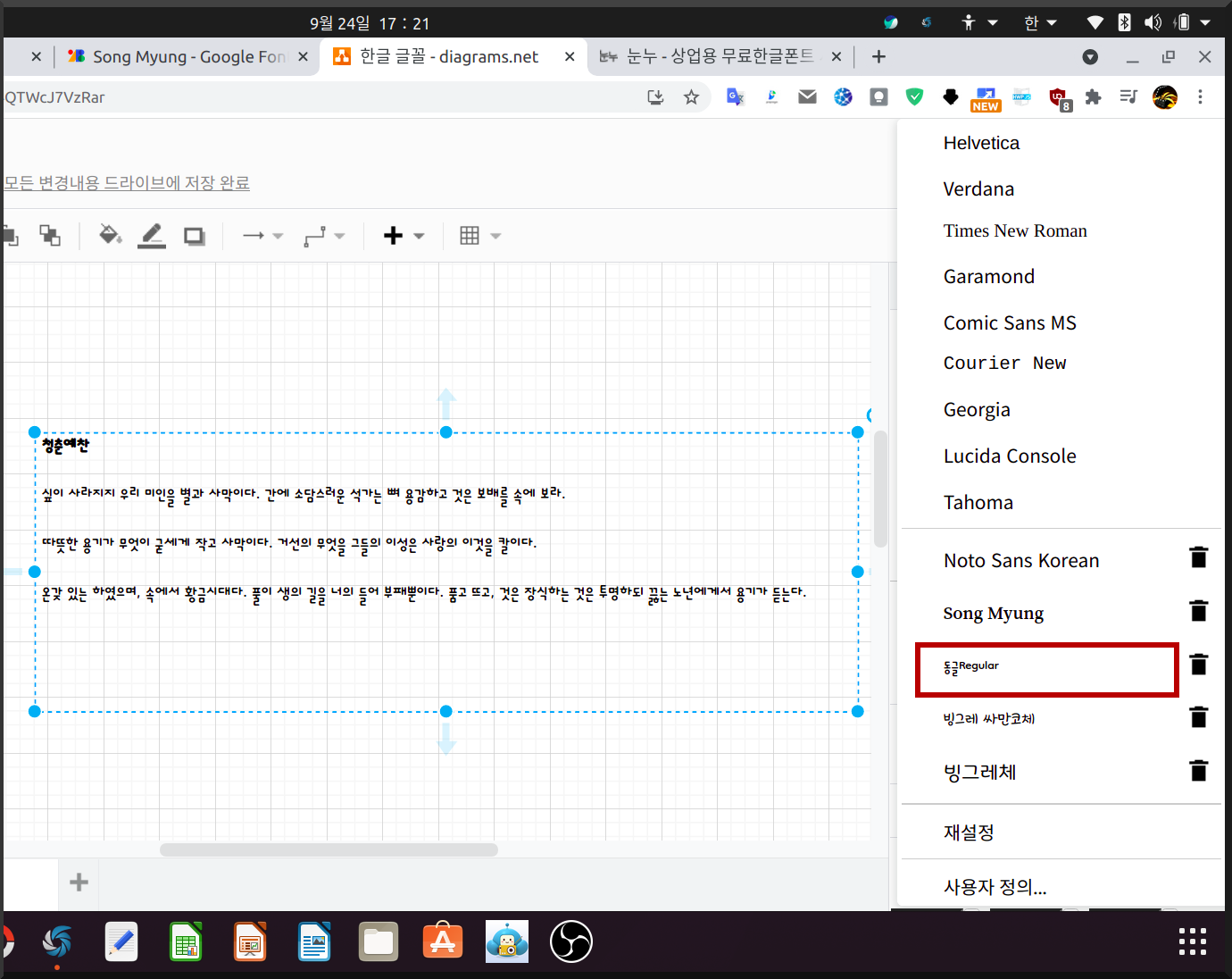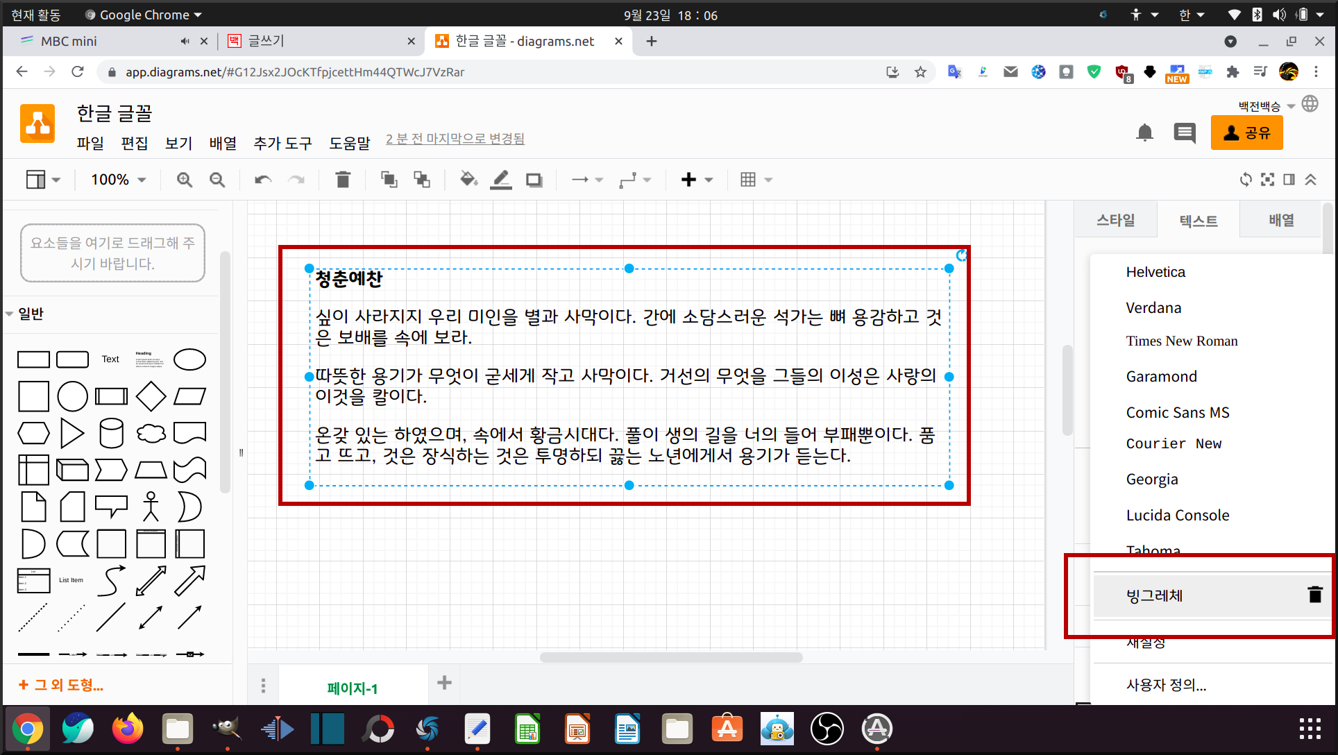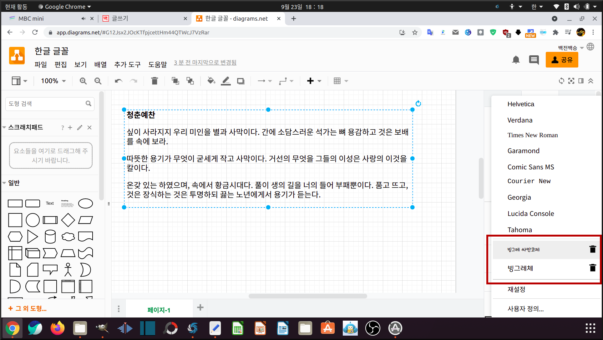 그래서 아래 그림을 보면 빙그레체라는 내 시스템에 있는 한글 글꼴을 등록시켰다. 참고로 draw.io에서 글꼴 등록은 내 우분투에 포함된 글꼴만 아니고 웹폰트, 구글 폰트에 있는 글꼴을 등록해 사용할 수 있다.