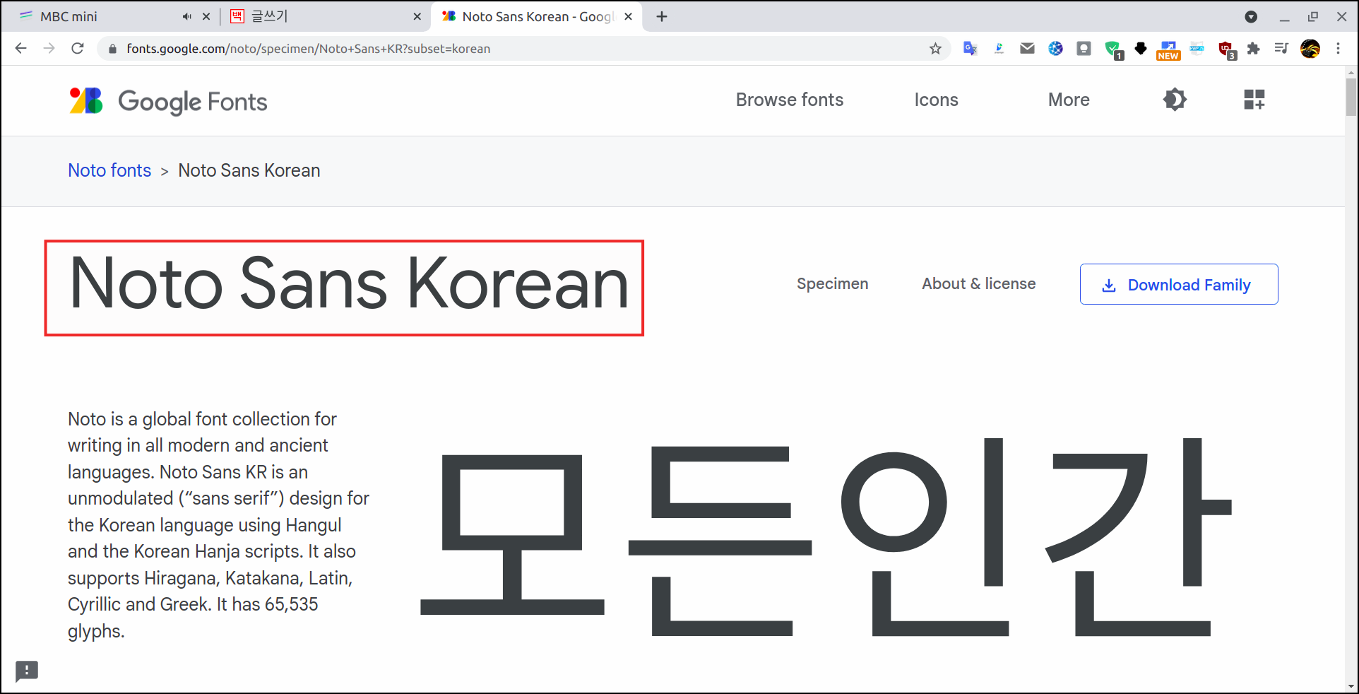 그러면 한글 글꼴만 나오게 된다. 한글 위에 글꼴 명이 나오는데 예로 Noto Sans Korean이라는 글꼴 명을 복사하기 위해 글꼴을 클릭하면 글꼴 명을 복사할 수 있다.