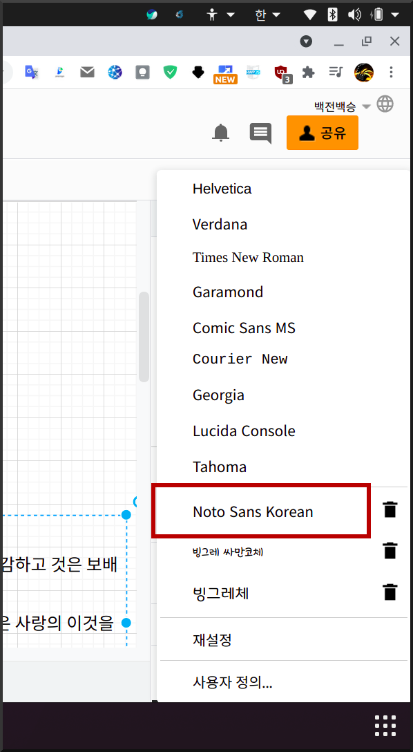 그리고 아래 그림처럼 draw.io의 Google Fonts에 붙이면 된다. 그러면 글꼴 목록에 Noto Sans Korean이 등록된 것은 확인할 수 있다.