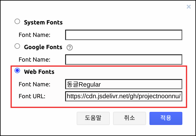웹 폰트의 경우는 아래 그림을 보듯이 웹 폰트 이름과 주소를 알면 된다. 상업적 이용 가능한 무료 한글 폰트 모음 사이트인 눈누에서 웹폰트도 제공한다. 눈누 사이트는 구글에서 눈누라는 키워드로 검색했으며 사이트 주소는 https://noonnu.cc/와 같다. 아래 그림처럼 동글Regular라는 웹 폰트 이름과 주소를 입력했더니 글꼴 목록에 등록되어 글꼴이 변했다.