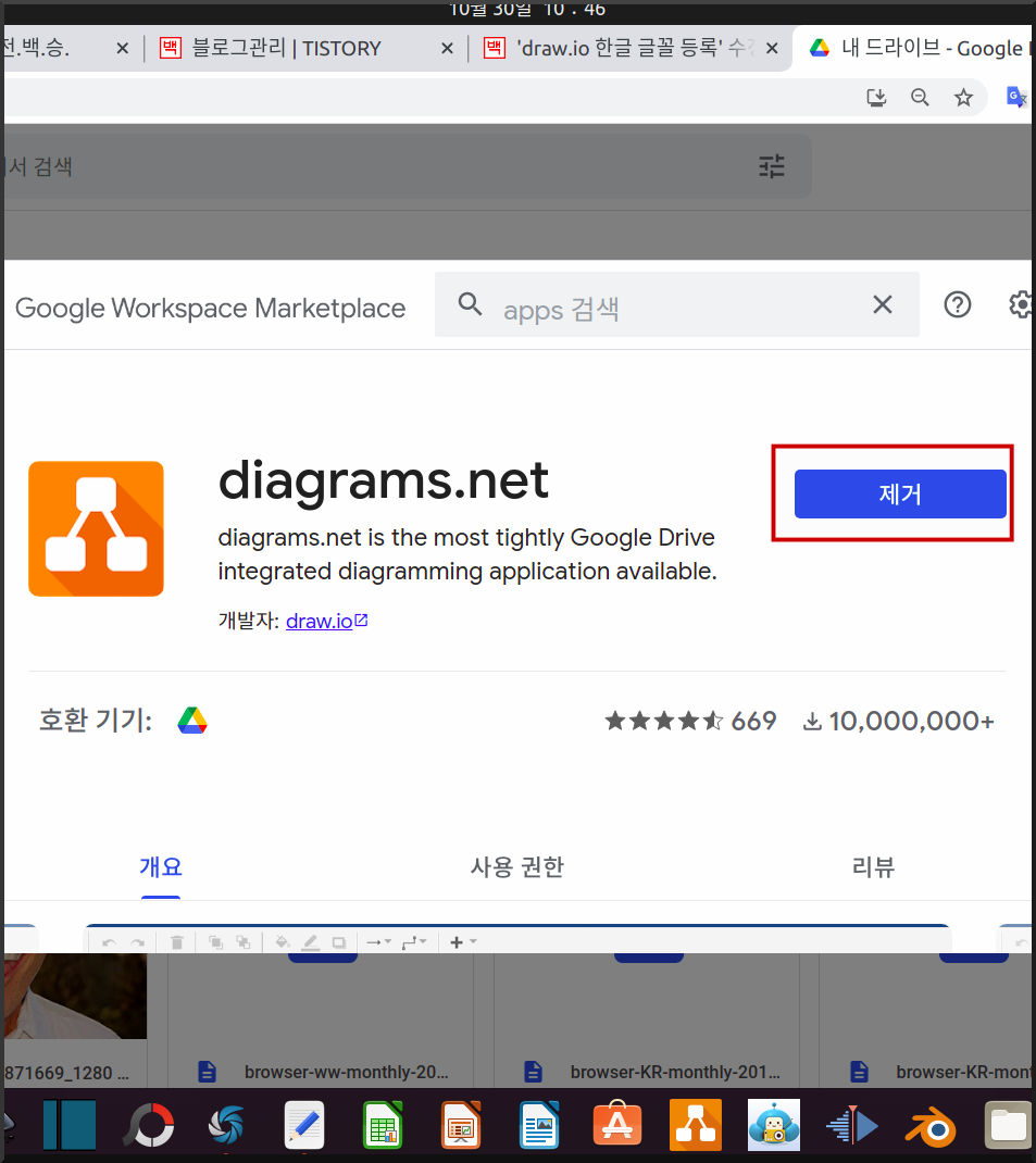 draw.io는 구글 드라이브에서 무료로 접할 수 있다. draw.io는 무료이고 한글을 지원한다. 만든 문서 파일을 안전하게 구글 드라이브에 저장한다. 아래 그림은 구글 드라이브에 draw.io 등 앱을 설치한 것을 볼 수 있다. 더보기 > 연결할 앱 더보기를 클릭하여 draw.io를 추가한다. 아래 그림에 diagram.net이 draw.io다. 나는 이미 draw.io를 설치했기 때문에 제거라는 버튼이 나오는 것이다. 만약 설치하지 않았다면 설치라고 나왔을 것이다.