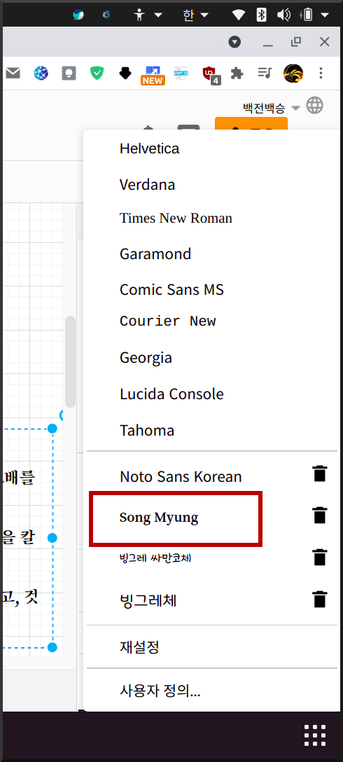 - 글꼴 목록이 나오면 사용자 정의...를 클릭한다.