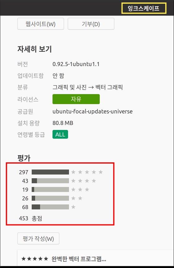 그리고 아래 그림은 우분투 프로그램으로 본 것으로 김프보다는 총점은 낮았지만 잉크스케이프보다 좋았다. 개인적으로 리눅스에서 그래픽 프로그램은 김프와 잉크스케이프라 생각했는데 아니었다. 참고로 우분투를 포함해서 리눅스에서 아래 평점에서 볼 수 있듯이 1순위 그래픽 프로그램은 김프(Gimp)이다. 김프는 리눅스의 포토샵라 한다. 말로만 김프를 포토샵라 하는 것이 아니고 정말 포토샵에서 봤던 기능이 많다.