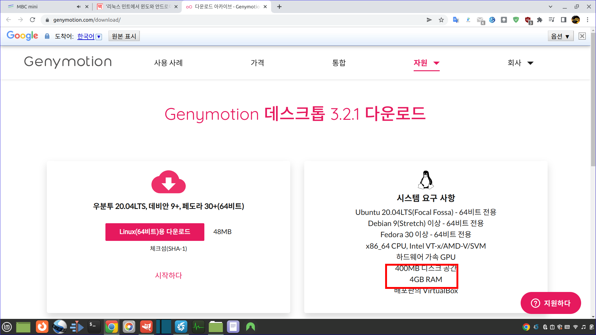그래서 요전에 메모리를 업그레이드했는데 와인, Genymotion 등을 실행한 후에 메모리 부족에 시달리지 않는다. 거기에 CPU가 좋다면 더 빠를 것 같다. 아래 그림을 보면 우분투와 Genymotion에서 요구하는 메모리를 볼 수 있다. 와인(Wine), Genymotion 등을 원활히 실행하기 위해 적어도 8GB 이상은 되어야 할 것 같다.