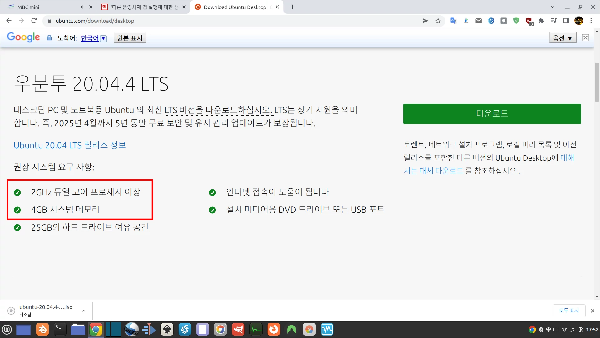 우분투의 권장 시스템 요구 사항에 4GB 메모리... 나는 리눅스의 경우 윈도에 비해 가볍다고 생각했다. 위에 적었듯이 윈도 10의 권장 메모리는 2GB고 윈도 11은 4GB다.