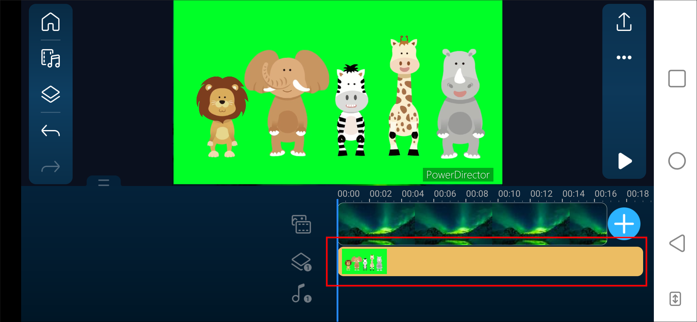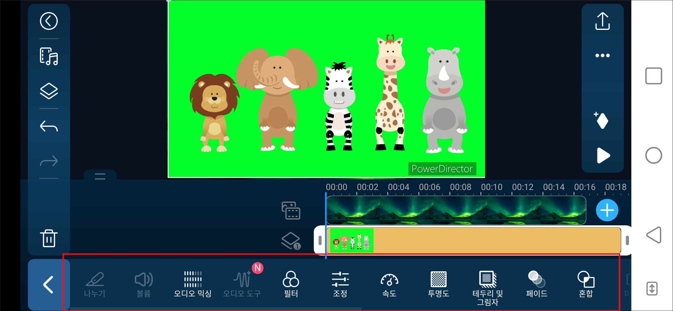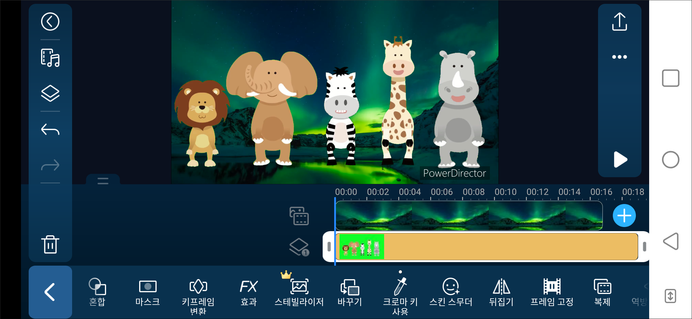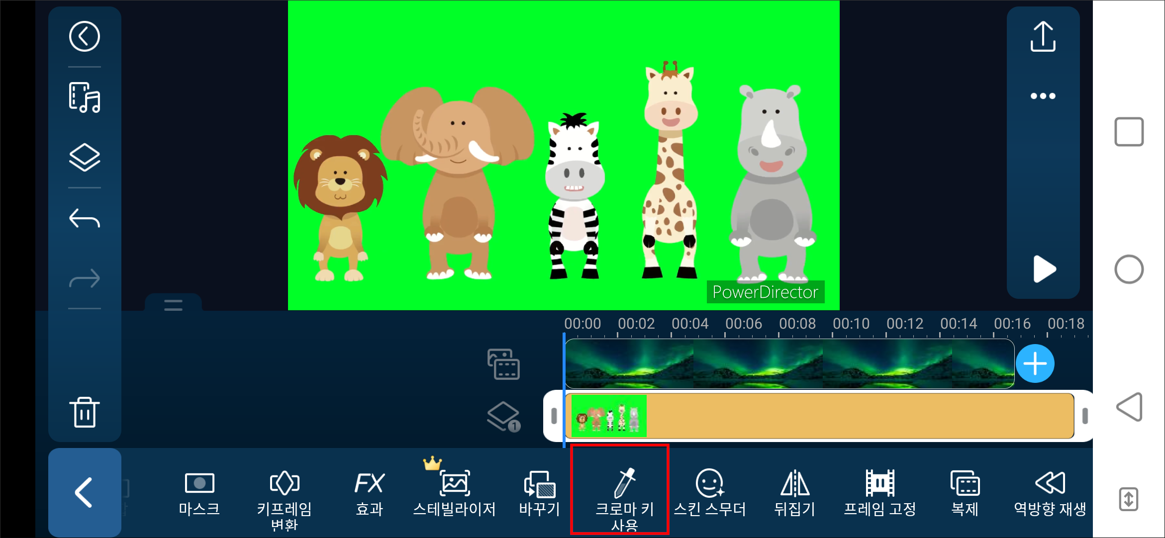 아래 그림을 보면 파워디렉터 모바일 앱은 크로마 키 기능을 지원한다는 것을 알 수 있다. 크로마 키를 사용하면 녹색, 파란색 배경을 투명하게 할 수 있다.