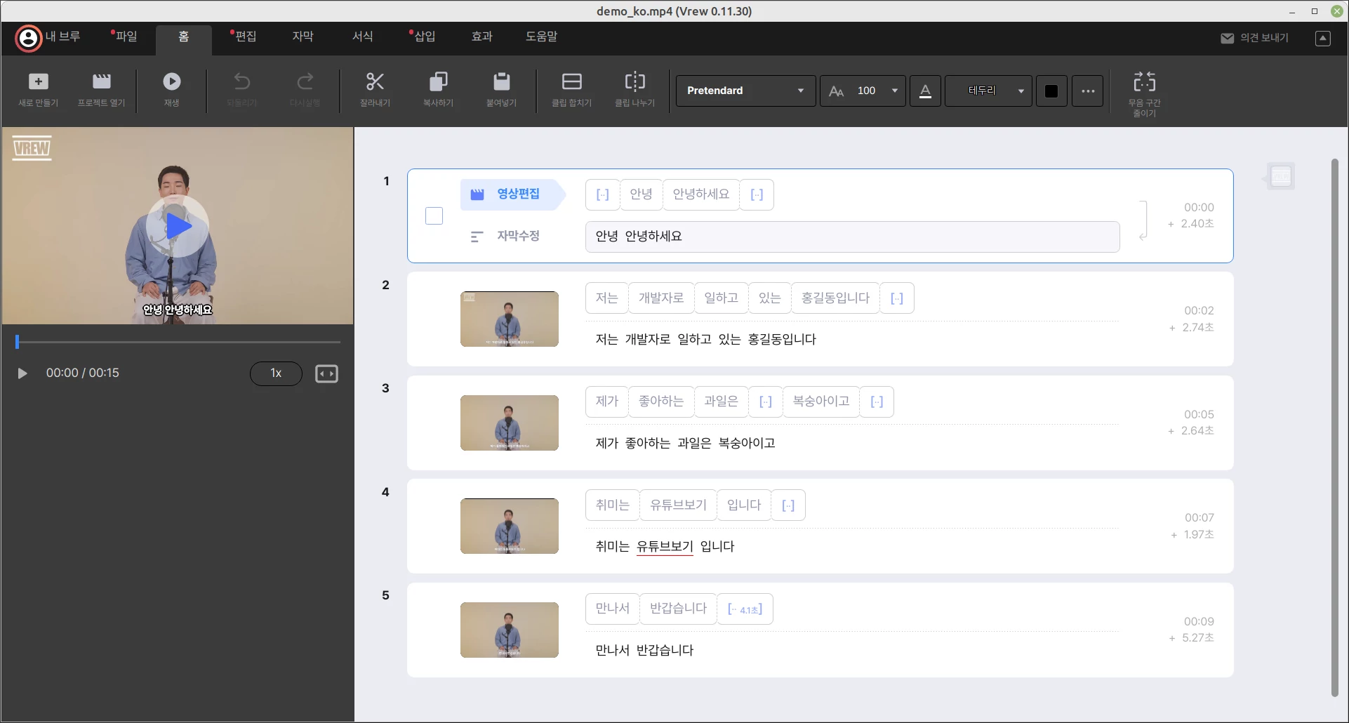 VREW라는 프로그램으로 추출한 결과는 아래와 같았다. 원문과 비교하여 거의 차이가 없다. 발음이 또렷하여 띄어쓰기 등을 수정할 필요가 없이 거의 완벽하게 추출했다. 발음이 부정확하면 맞춤법 등을 많이 수정해야 한다.