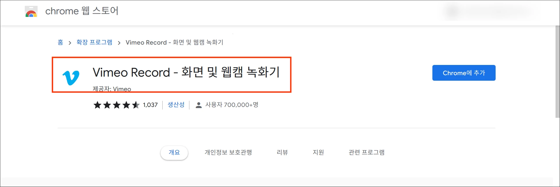 위에 적었듯이 화면 녹화를 위해서는 크롬에 아래 그림에 나온 Vimeo Record - 화면 및 웹캠 녹화기라는 확장 프로그램을 설치해야 한다. 그러면 녹화 품질은 720p로 하고 1080p 이상은 없다. 그리고 녹화한 동영상은 비메오의 내 계정에 저장되고 MP4로 다운로드할 수 있다.