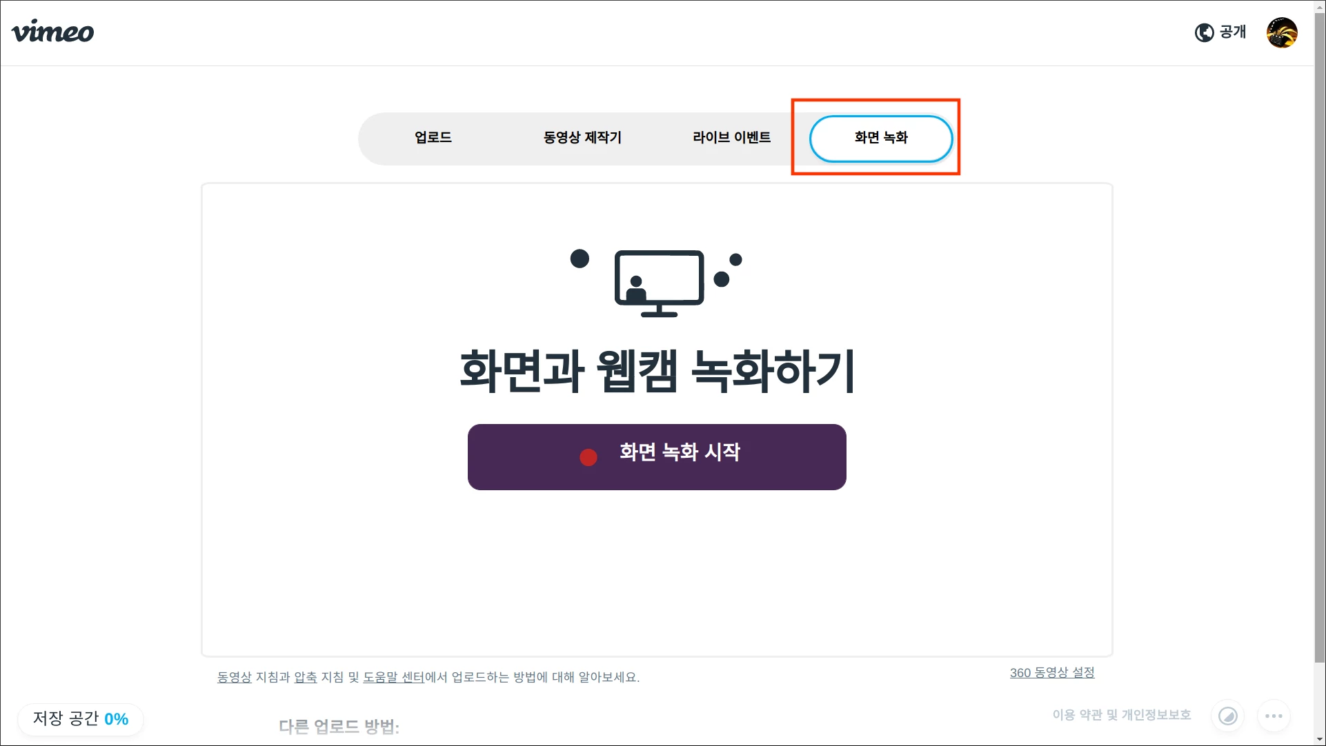 내 비메오(vimeo) 계정을 보다가 동영상 업로드할 때 아래 그림처럼 화면 녹화라는 것을 생긴 것을 알게 됐다. 이때 Vimeo Record - 화면 및 웹캠 녹화기라는 확장 프로그램을 크롬에 설치하는 것이 필요하다는 것을 알게 됐다. 참고로 간단히 비메오는 유튜브, 카카오TV, 네이버 TV 등과 비슷한 동영상 공유 웹사이트다.