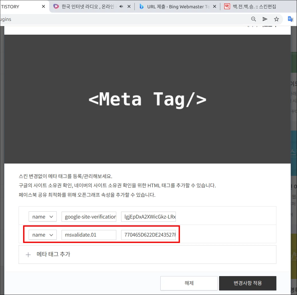 빙 웹마스터에 등록된 사이트(블로그)를 삭제하고 처음부터 다시 등록했다. 예전에 등록했듯이 사이트 수동 추가로 사이트 등록을 했다. 예전과 다르게 이번에는 확인 코드를 메타태그 등록이라는 이름의 플러그인으로 했다. 메타 태그를 플러그인에 등록한 후 블로그를 확인했다. 그리고 사이트맵 등을 등록했다.