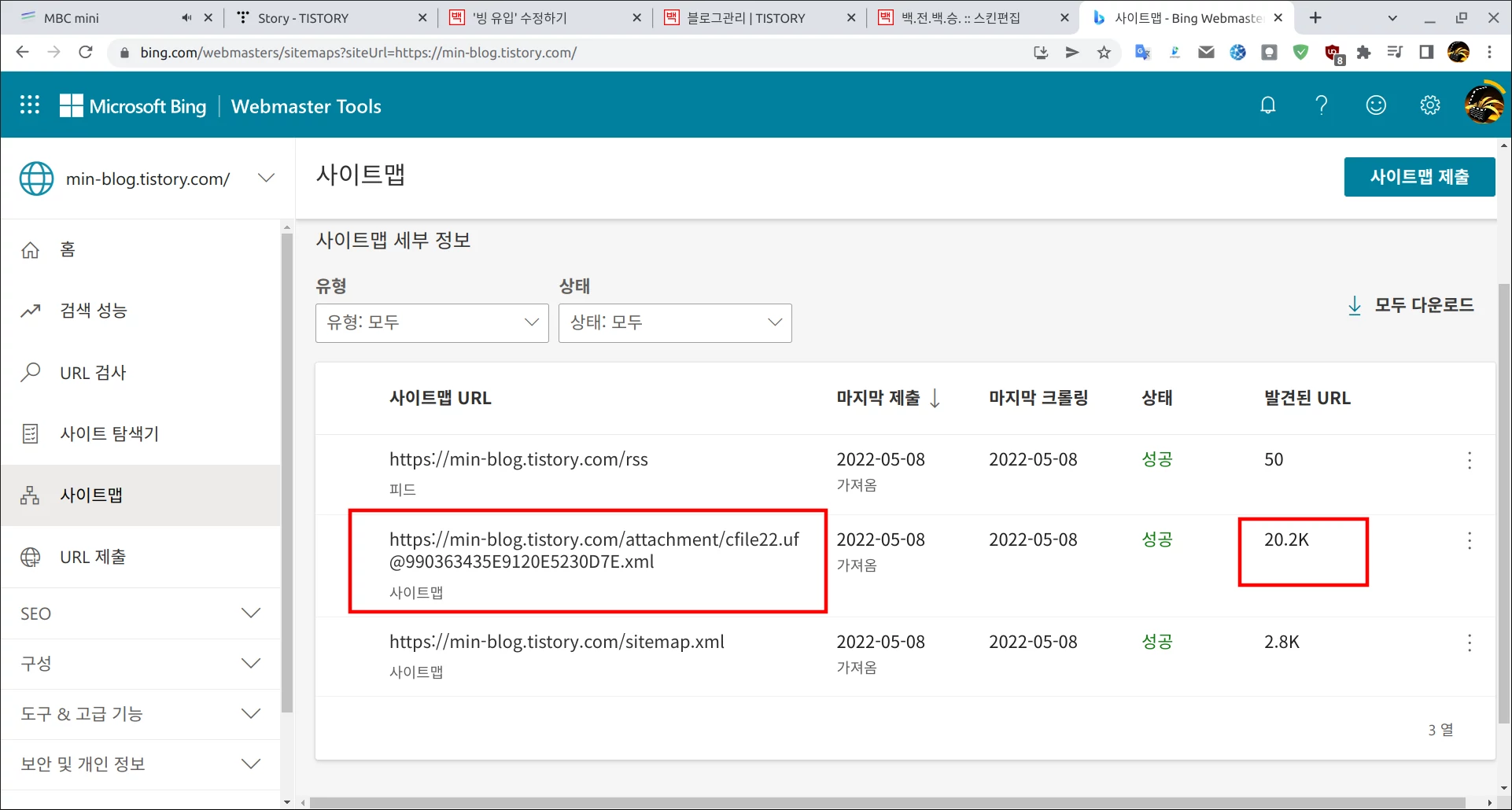 그리고 구글 웹마스터에 등록된 이 블로그 정보를 가져온다. 그래서 사이트맵을 봤더니 구글 웹마스터에 등록된 사이트맵이 있었다. 티스토리가 https://블로그 주소.sitemap.xml을 제공하지 않는 파일도 가져와 좋았다. 아래 빨간색 사각형에 있는 파일은 특정 사이트에서 만들었다. 그때 사이트맵을 어느 사이트에서 만들었는지 기억이 나지 않는다. 그 사이트맵에 URL을 보니 20.2K지만 티스토리에서 제공하는 사이트맵은 고작 2.8K...