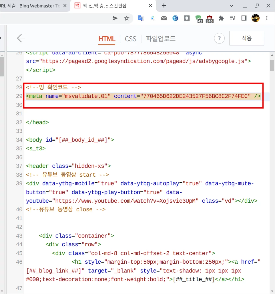그래서 빙 확인 코드를 위에서 말한 아래 그림 첫째와 둘째 그림처럼 메타태그 등록이라는 플러그인을 사용하지 않고 아래 세 번째 그림처럼 <head></head> 안에 삽입했다.