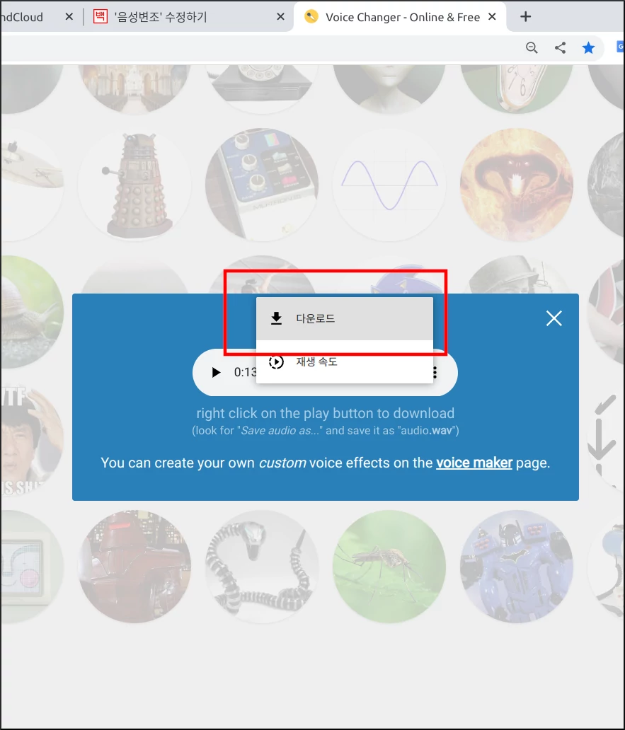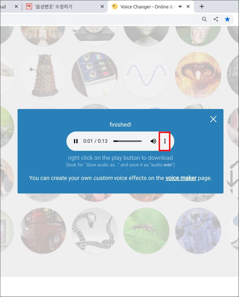 3. 변조는 원하는 것을 선택했다면 플레이어가 나와 자동 재생돼 변조된 음성을 들을 수 있다. 그 음성이 마음에 들면 점 세 개를 클릭하여 다운로드하면 된다. 다운로드할 수 있는 파일 형식은 wav 형식이다.