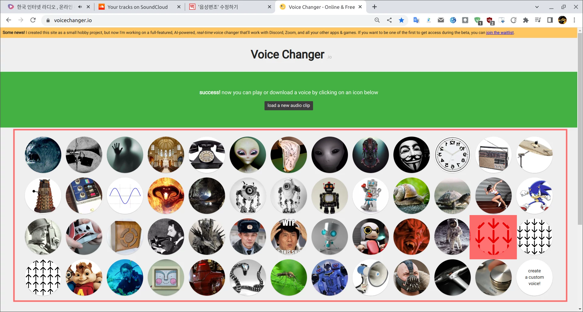 2. 그러면 아래와 같이 success!라고 업로드에 성공했다는 등의 메시지가 나온다. 그런 후 바로 빨간 사각형 박스 안에서 있는 것 중에 음성을 변조할 것을 선택한다. 나는 목소리가 잘 들리면서 원본 음성이 여성 목소리니 여성 목소리라는 느낌이 안 나게 하고 싶었다. 그래서 많은 음성에서 아래 그림에서 빨간 정사각형을 선택했다.