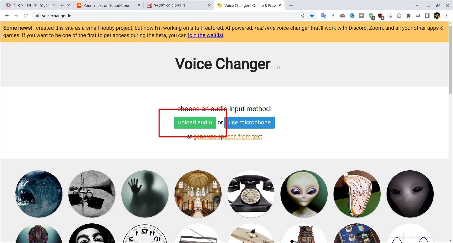 유튜브를 보다가 voicechanger라는 프로그램을 사용하여 음성변조에 대한 내용을 알게 됐다. 그래서 그 프로그램이 윈도우가 아닌 리눅스도 지원하는가 검색했다. 하지만 그 프로그램이 존재하지 않았다. 하지만 프로그램이 없는 대신 웹브라우저를 통해 음성변조가 가능하다는 것을 알았다.