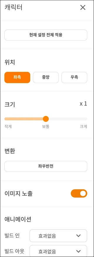 아래 그림을 보듯이 캐릭터의 위치, 크기 등을 설정하면서 자막을 속도 등을 조절하면서 세세하게 읽어줄 수 있다. 개인적으로 캐릭터가 읽어주게 하는 기능이 마음에 든다.
